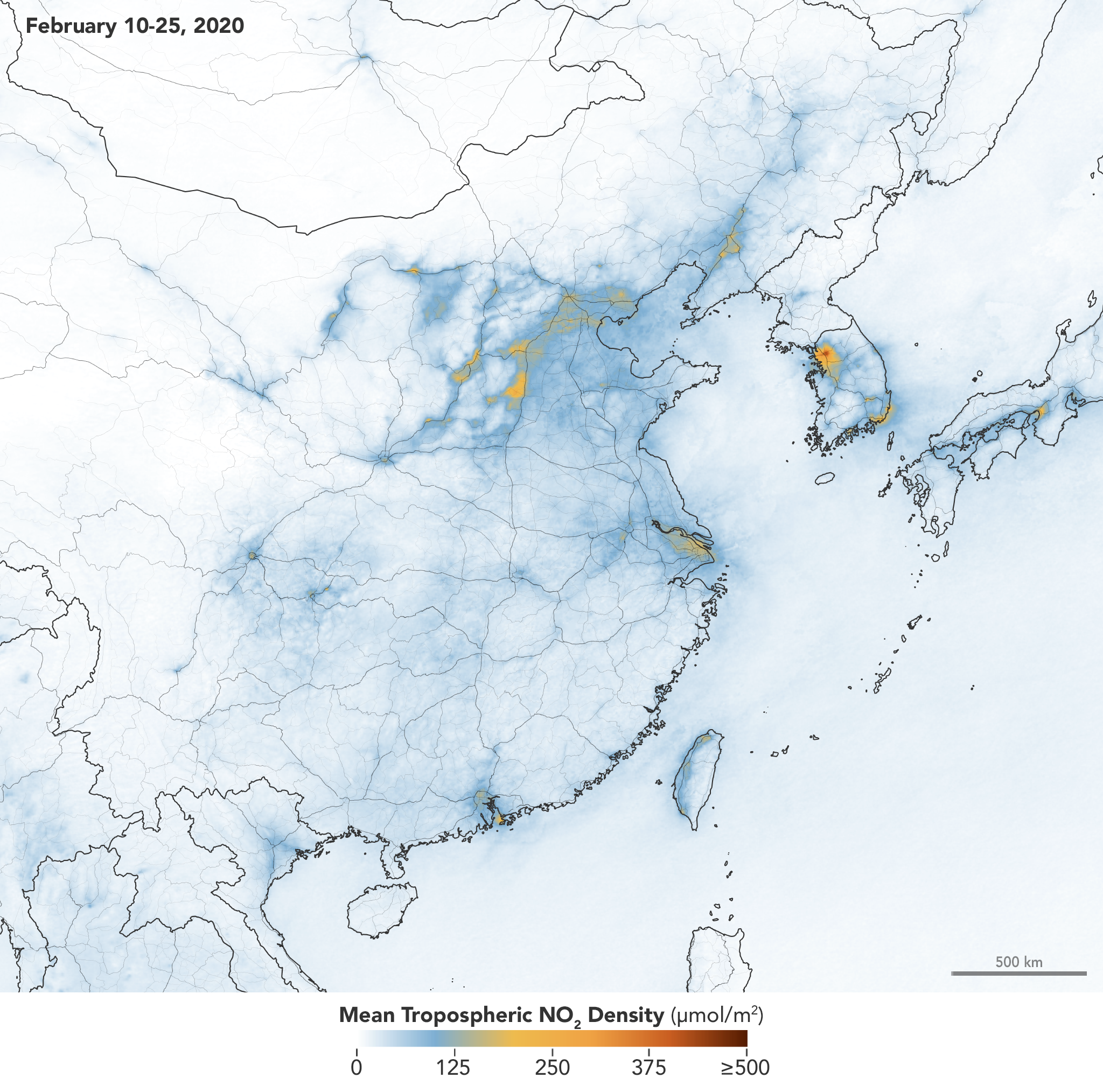 The drop in nitrogen dioxide in 2020 also coincided with Lunar New Year celebrations in China and much of Asia. Generally, businesses and factories close from the last week in January into early February to celebrate the festival. Past observations have shown that air pollution usually decreases during this period and then increases once the celebration is over.