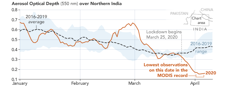 According to Gupta, AOD levels in northern India at the beginning of April were significantly below the norm for this time of year and the lowest in 20 years of MODIS observations. Ground observation stations in India have also reported a decrease in particle pollution in the region. Anecdotally, people in the northern state of Punjab have reported seeing the Himalayas for the first time in decades.