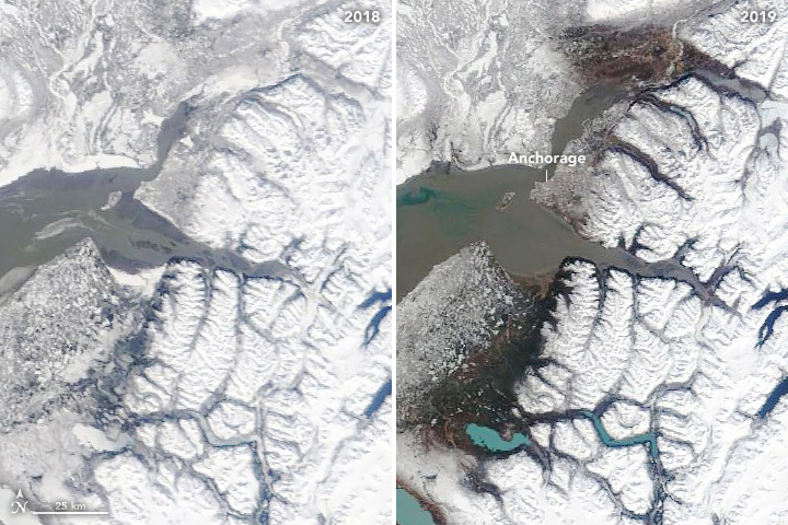 While the north and northwest parts of the state were wetter than usual, other parts were unusually dry. These natural-color images, acquired with MODIS on NASA’s Terra satellite, show Anchorage on March 30, 2018 (left), and March 30, 2019 (right). According to reports, March 2019 is only the second time on record that there was no measurable snowfall in Anchorage during the month.
