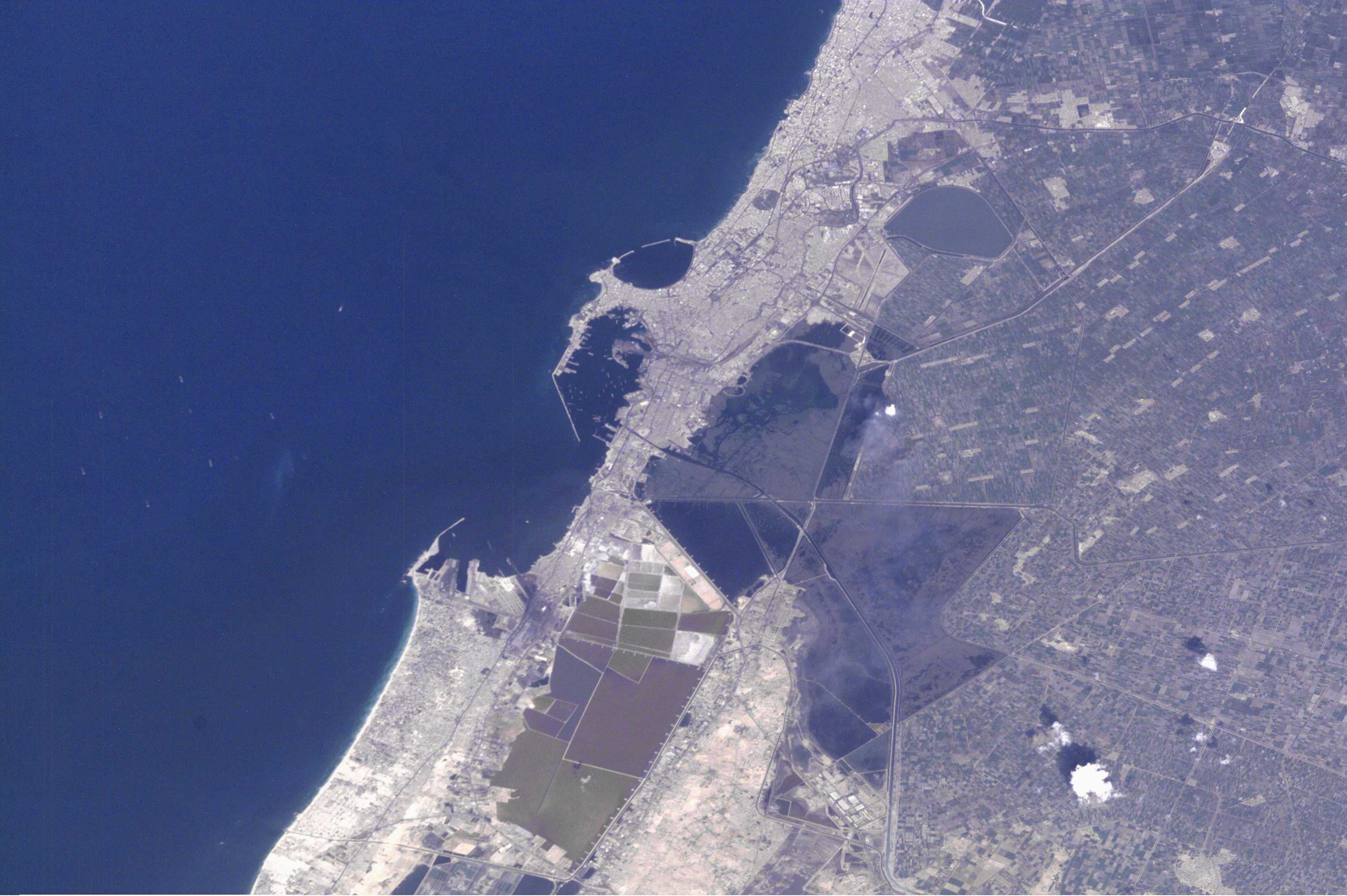 This image of Alexandria was taken by astronauts on board the International Space Station in December 2000 using an Electronic Still Camera. A wider-angle view (STS088-739-90) taken from the Space Shuttle in December 1998 is available for context.