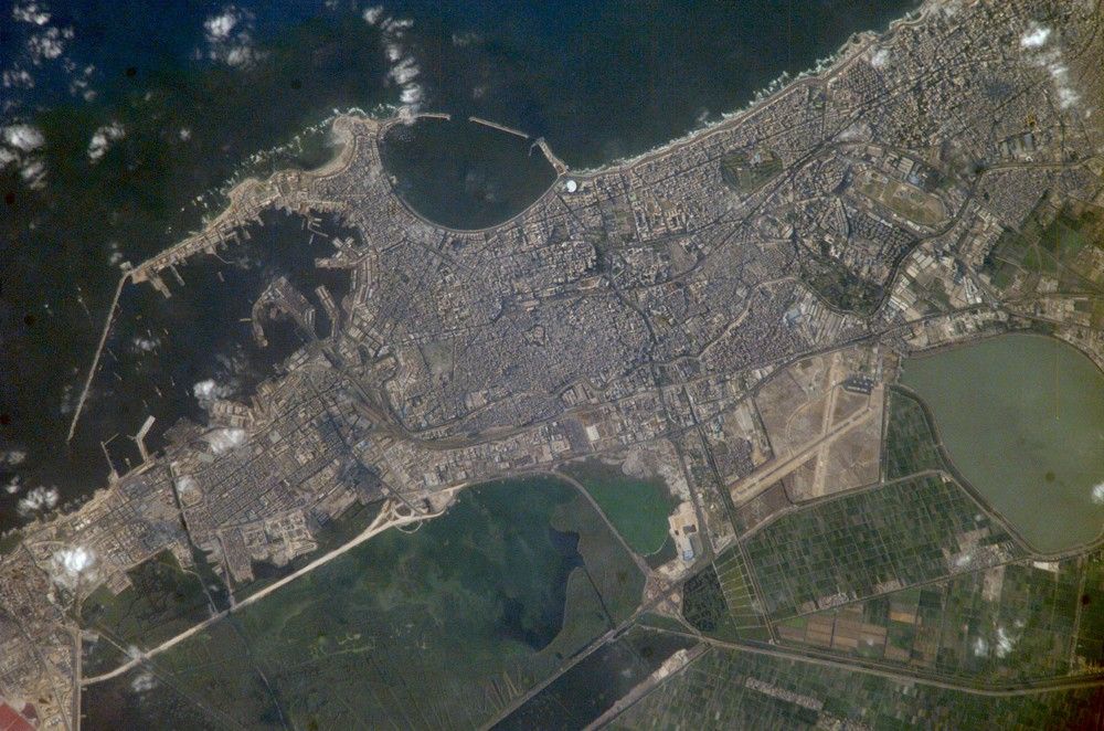 The Eastern Harbor was the main port in the Middle Ages. This detailed image taken by Space Station crew members using an 800-mm lens provides a view of the modern port facilities in the Western Harbor, where wharves and many moored ships can be detected. The lower box indicates the part of the city where the famous Library of Alexandria was located, and also where Alexander the Great may be buried. The upper box indicates the entertainment quarter where literary figures from the Middle East and Europe have worked. A wider view of the city was taken from the International Space Station in December 2000.