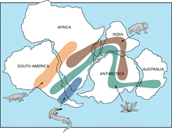 Certain fossils appear in continuous bands across continents that are now separated by thousands of miles of ocean. Wegener believed this fact was one of the strongest pieces of evidence for his theory. In the above map, orange indicates the fossil remains of Cynognathus, a Triassic land reptile. Dark blue indicates fossil remains of the freshwater reptile Mesosaurus. Green indicates fossils of the fern Glossopteris, found in all of the southern continents. Brown indicates fossil evidence of the Triassic land reptile Lystrosaurus. (Map courtesy This Dynamic Earth, United States Geological Survey)