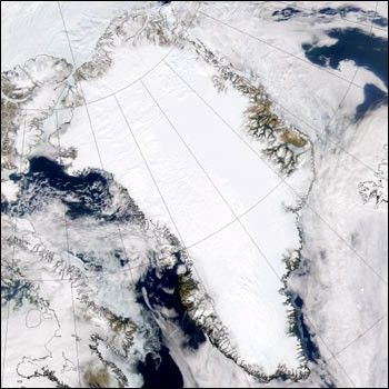 Greenland, despite its name, is almost entirely covered in glaciers, as shown by this satellite image. (Image courtesy Sea-viewing Wide Field-of-View Sensor science team, copyright ORBIMAGE)