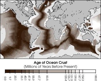 Some of the earliest evidence confirming Wegener's theories of continental drift was revealed when geologists measured the age of the ocean floor. Crustal rocks near the mid-ocean ridges are always very young, while the ocean crust along continental margins, furthest away from the ridges, is hundreds of millions of years older. New ocean floor is being created at the mid-ocean ridges—pushing the continents along. (Map courtesy Discovering Plate Boundaries, Rice University)