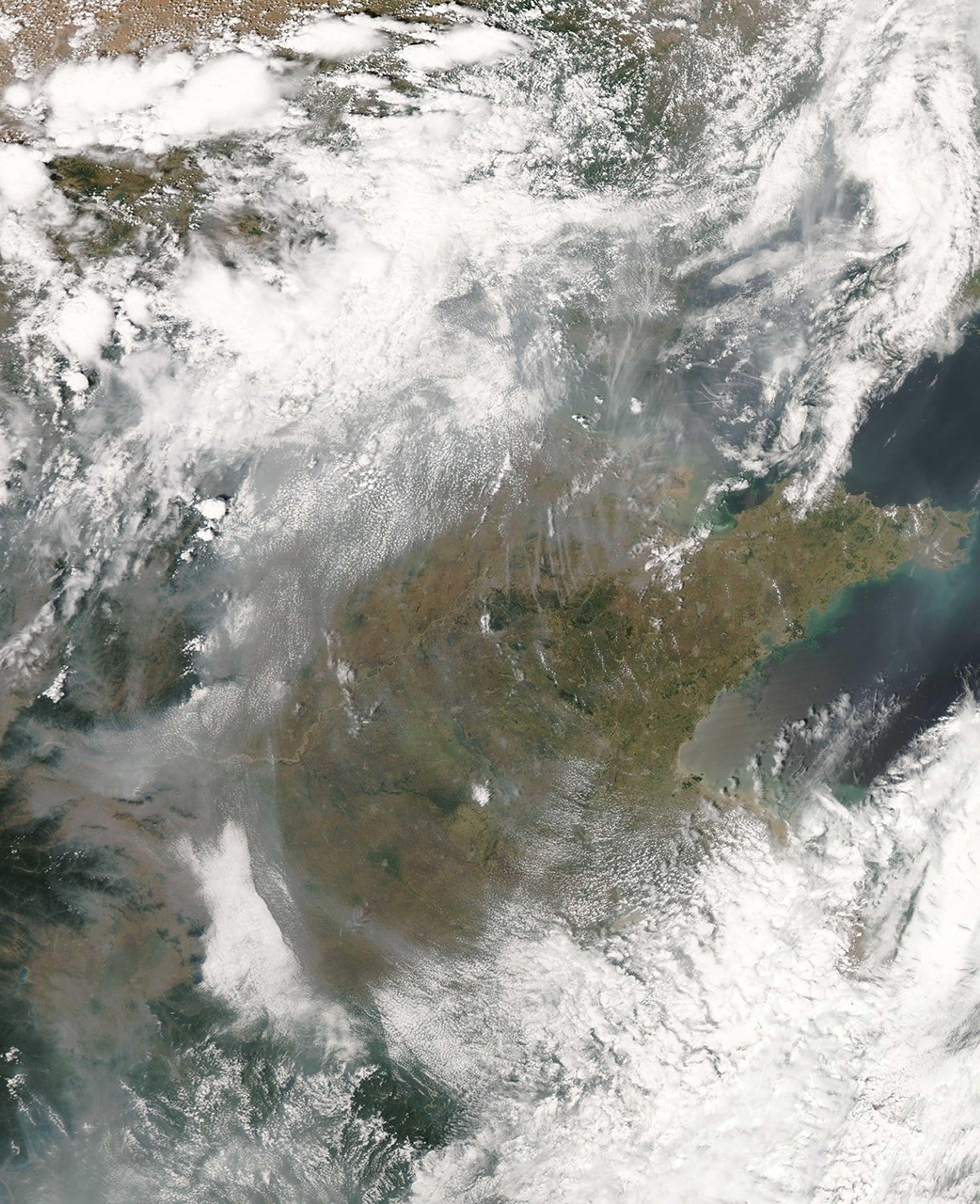 These images show the bay at the beginning of a local cleanup effort. (Daily images of the area are available from the MODIS Rapid Response Team.) With sailing events scheduled to begin on August 9, Chinese officials ordered the algae cleanup to be completed by July 15. A spokesman for the Qingdao Sailing Committee planned to complete the project by July 10. The cleanup effort included 20,000 people and 1,000 boats.