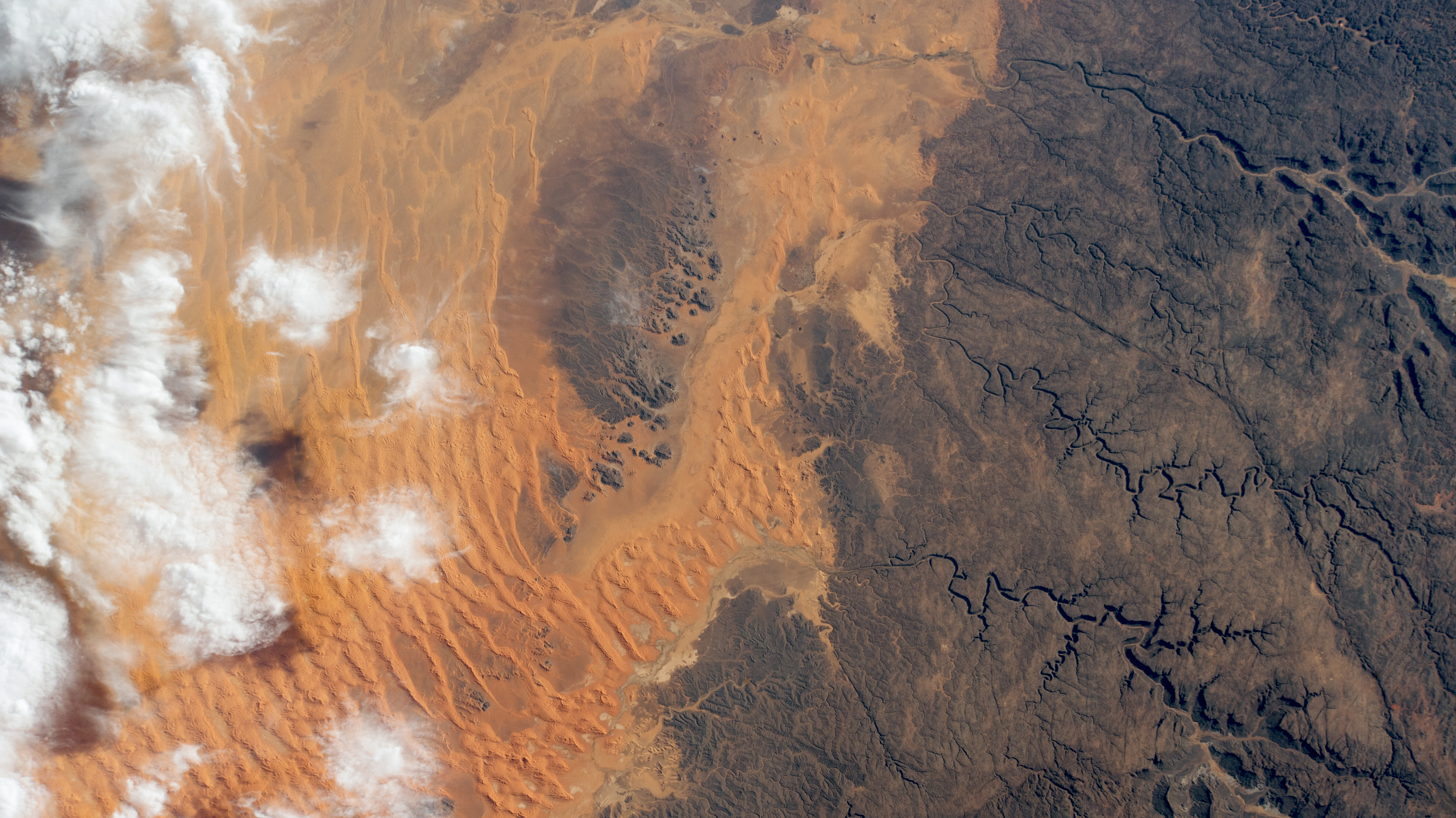 Orange-hued dunes mantle dark sandstone on the northern edge of Algeria’s Tassili n’Ajjer National Park in this photo from an Earth-facing external camera mounted on the International Space Station. The park’s name translates to “plateau of chasms,” and these signature ravines wind through the rock in the right of the image. On the left, wisps of cloud overlie a dune field that has swept over the low-lying regions north of the Fadnoun Plateau.