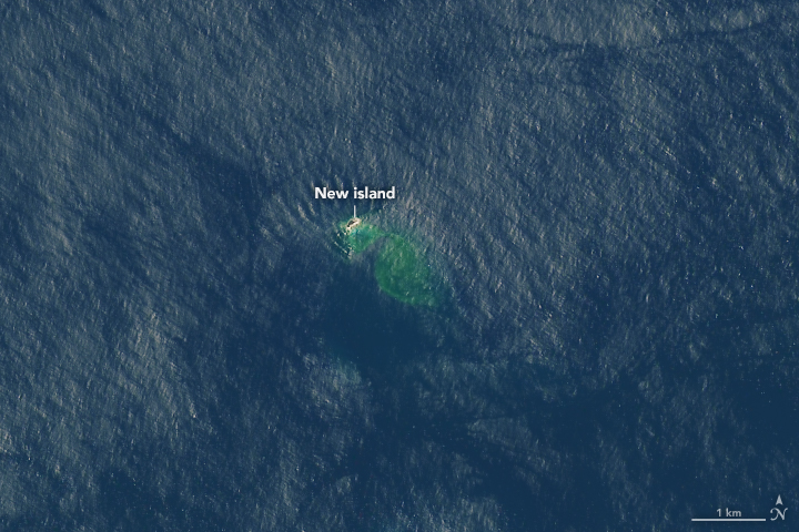The birth of the island is visible in these images, acquired with the Operational Land Imager (OLI) on Landsat 8. The top image shows the eruption on its third day, October 16, 2019. The false-color image combines shortwave infrared, near infrared, and blue light (bands 7-5-2) to help distinguish the hot spots associated with the eruption (red). Scientists say the emissions were dominated by steam and volcanic gases.