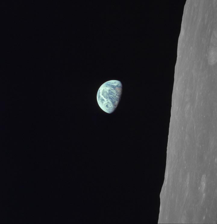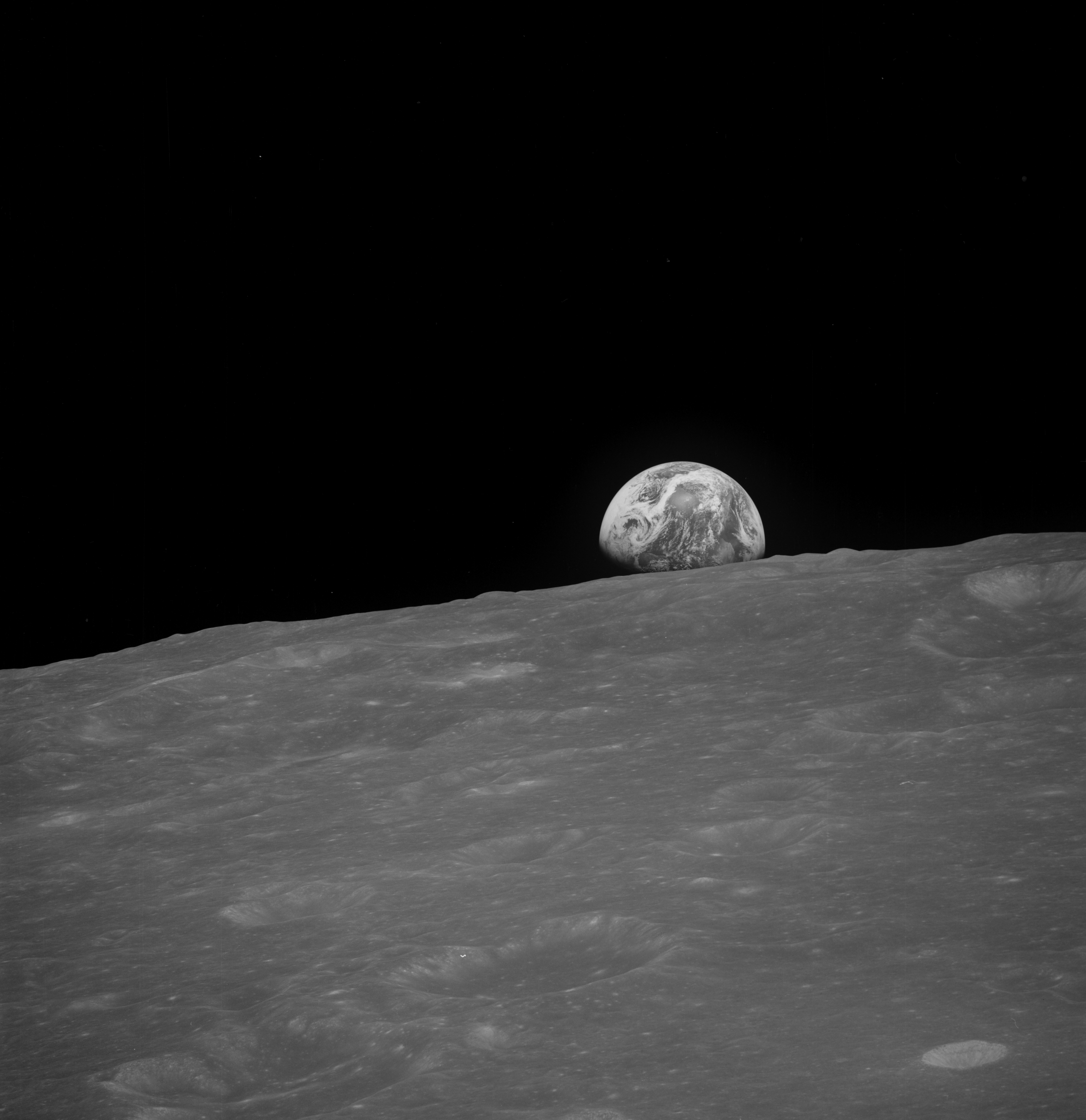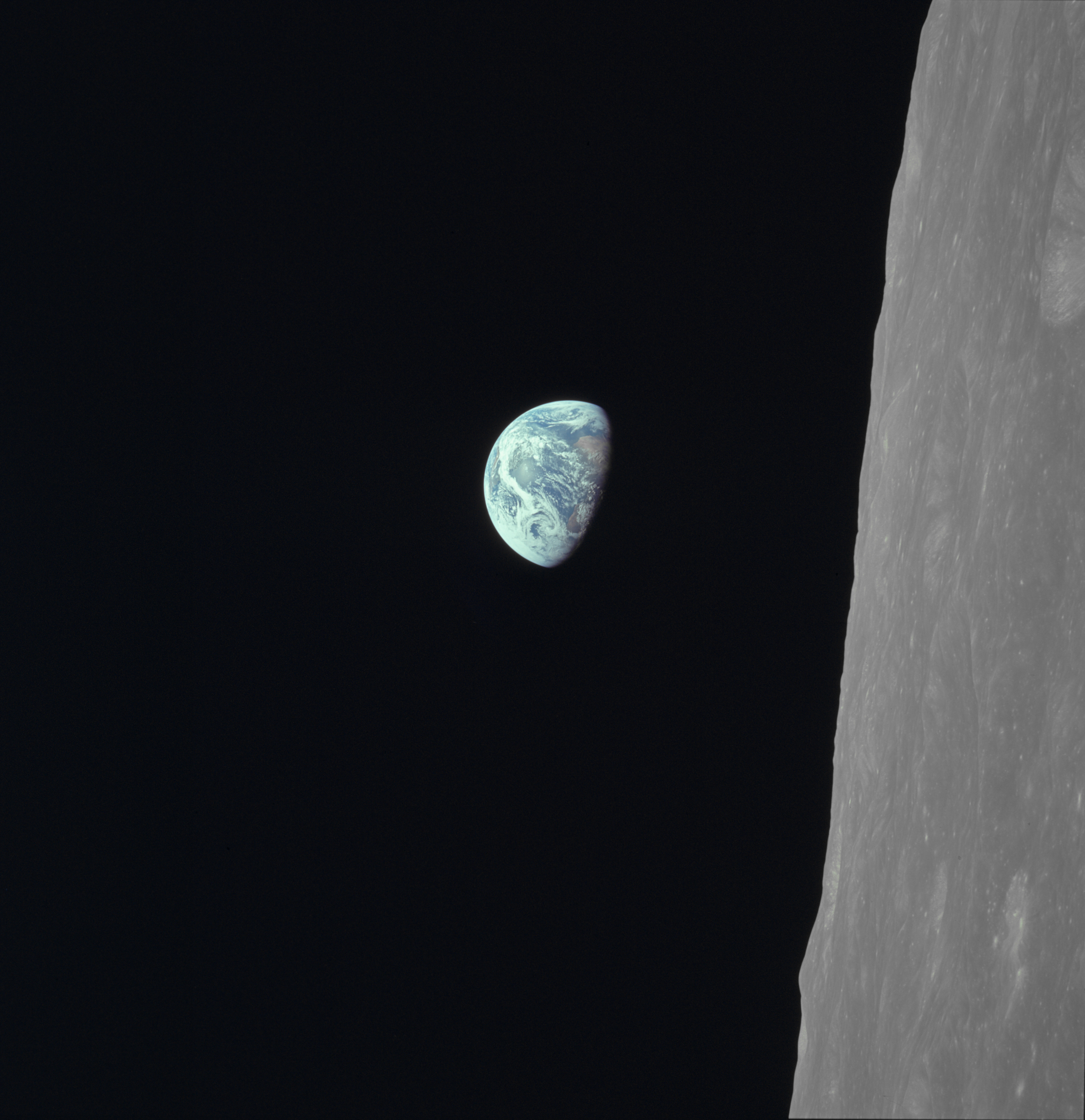 The color photograph below, shot the same day by William Anders, is presented here in the manner in which he saw his home planet rising before him—in the vertical plane. On the Earth, the sunset terminator crosses Africa, and Antarctica is the white area near the left end of the terminator. North and South America are under clouds.
