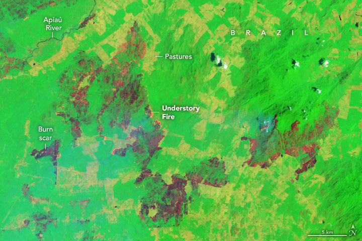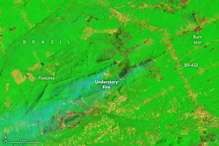 The false-color image below shows an understory fire that burned widely in the rainforest (green) after escaping from a pasture (yellow) along the BR-432 road near Vila Nova Paraiso. Active fire fronts appear orange, and burned areas are brown. The image was acquired by the OLI on Landsat 8 on February 23, 2024.