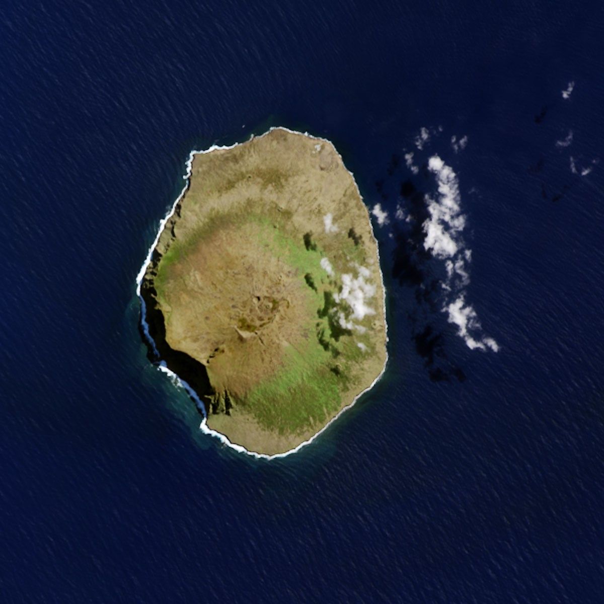 The Operational Land Imager (OLI) on Landsat 8 acquired this closeup view of Amsterdam Island on March 26, 2015. This volcanic summit sits near the East Indian Ocean Ridge, and it is the northernmost volcano above the water line on the Antarctic plate. The highest point of the island stands 867 meters (2,844 feet) above sea level. There are two calderas within an area of just 70 square kilometers.