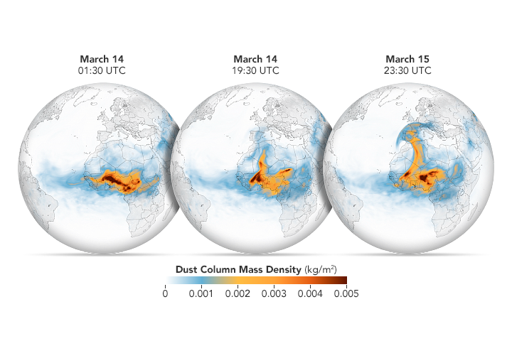 The maps above show a model of the dust plumes blowing across North Africa and into Europe on March 14 and 15. The model was generated by the Goddard Earth Observing System Model, Version 5 (GEOS-5), a global atmospheric model that uses mathematical equations to represent physical processes. Measurements of physical properties like temperature, moisture, and wind speeds and directions are routinely folded into the model to keep the simulation as close to observed reality as possible.