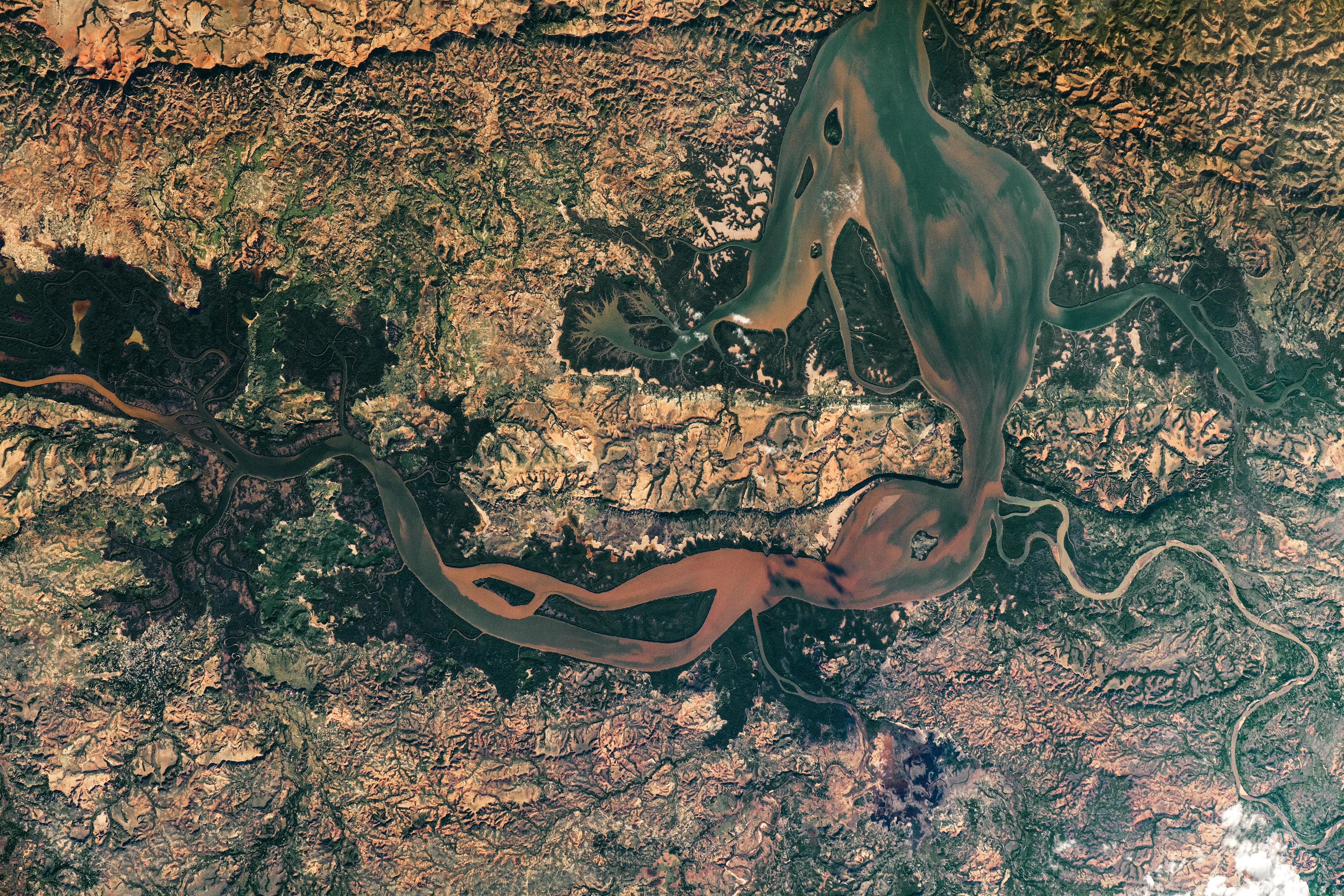 This photograph, taken by an astronaut from the International Space Station (ISS), captures the estuarine ecosystem of the Loza Bay wetlands in northwest Madagascar. Estuaries are coastal habitats where fresh water from rivers—in this case, the Ankofia and Maevarano—mixes with salt water from the ocean in partially enclosed basins.
