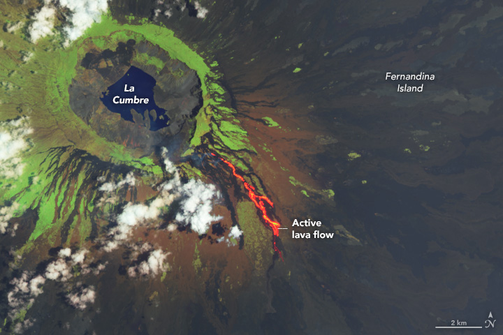 The infrared hot spot highlights an active lava flow, which extends to the southeast for roughly 6 kilometers (4 miles). Older lava flows appear black. Most of Fernandina is rocky and inhospitable to vegetation due to recent lava flows, but a ring of vegetation grows on the volcano’s upper slopes. Vegetation covers more of the other Galápagos islands, where eruptions are less frequent.