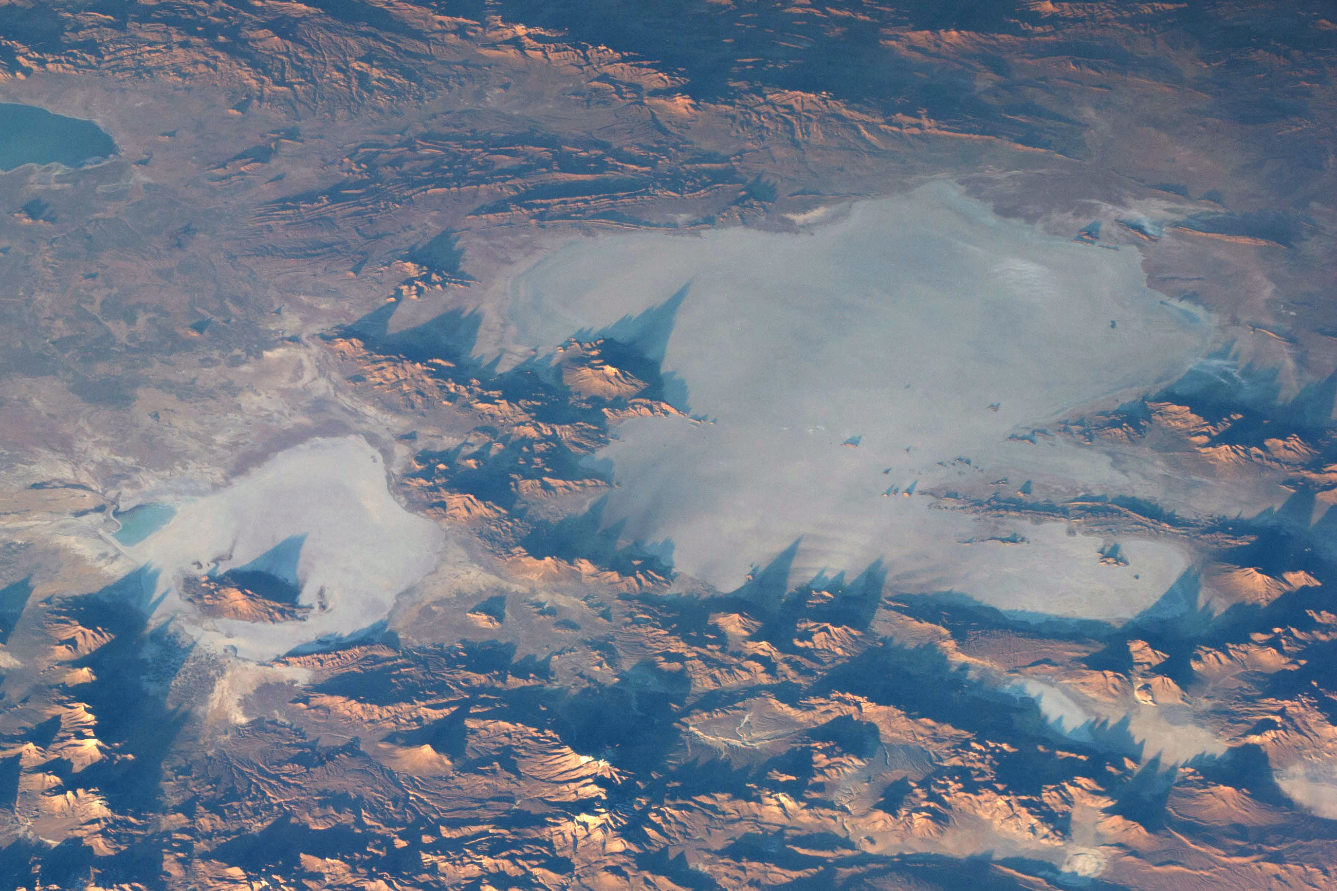 While the almost perfectly flat expanse of white can seem endless in photographs from the ground, this unique photograph offers a view on the playa as seen from the vantage point of an astronaut on the International Space Station. The smaller Salar de Coipasa is also visible to the northwest. The flat, white surfaces are comprised mainly of halite (common table salt) and gypsum, a soft mineral that is widely used in plaster and fertilizer. Several mountains, including the dormant volcano Mount Tunupa, cast long shadows across the salars.