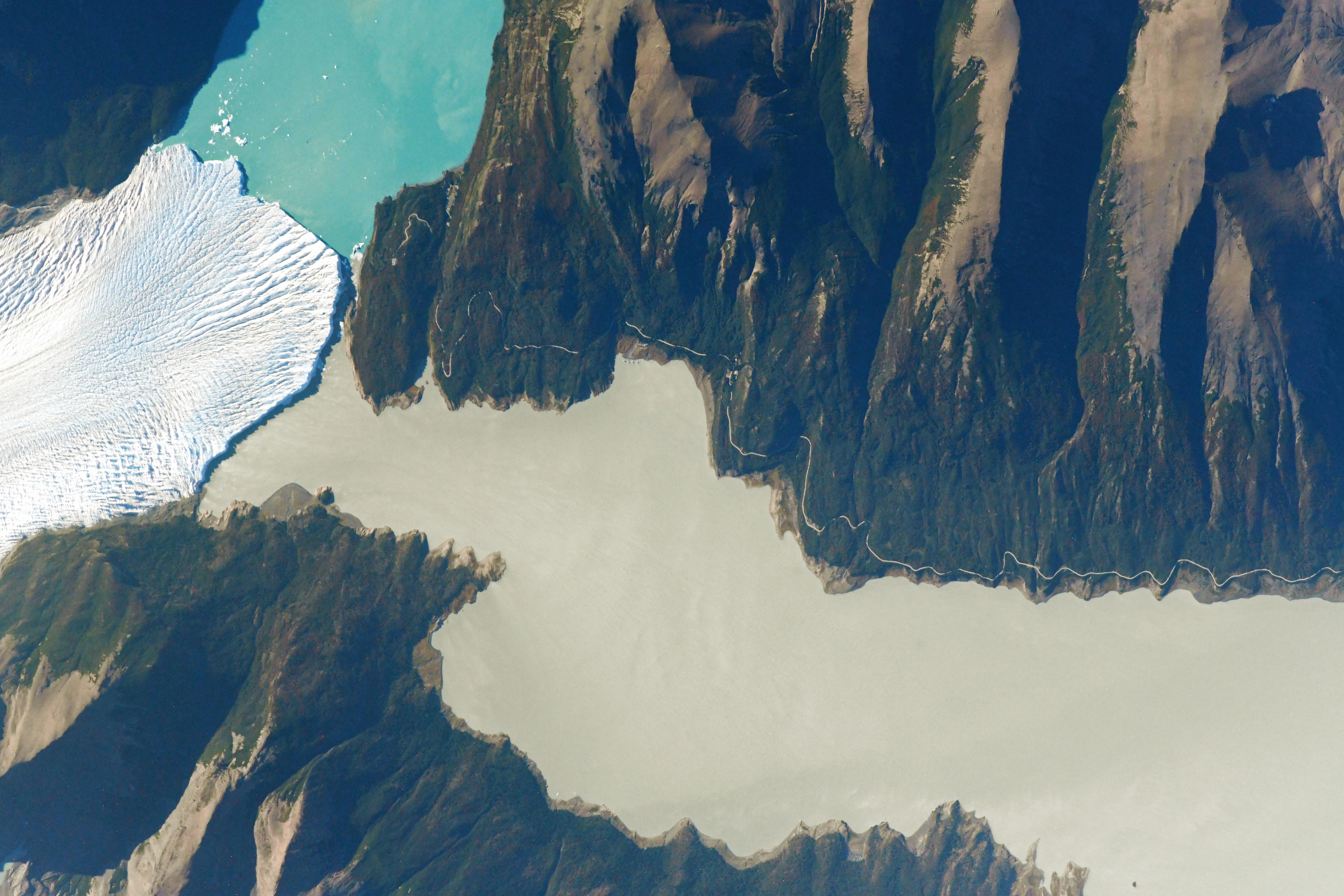 The heavily textured surface of Perito Moreno, one of the world’s last non-retreating glaciers, glistens in this detailed photograph taken by an astronaut from the International Space Station (ISS). The glacier, located at the southern end of the Southern Patagonian Icefield in Argentina, rises more than 60 meters (200 feet) above the surface of Lago Argentino to the northeast. It marks the separation point between the main lake and its murkier southern branch, Brazo Rico. A single road winds along the coast of Peninsula Magallanes toward Moreno.