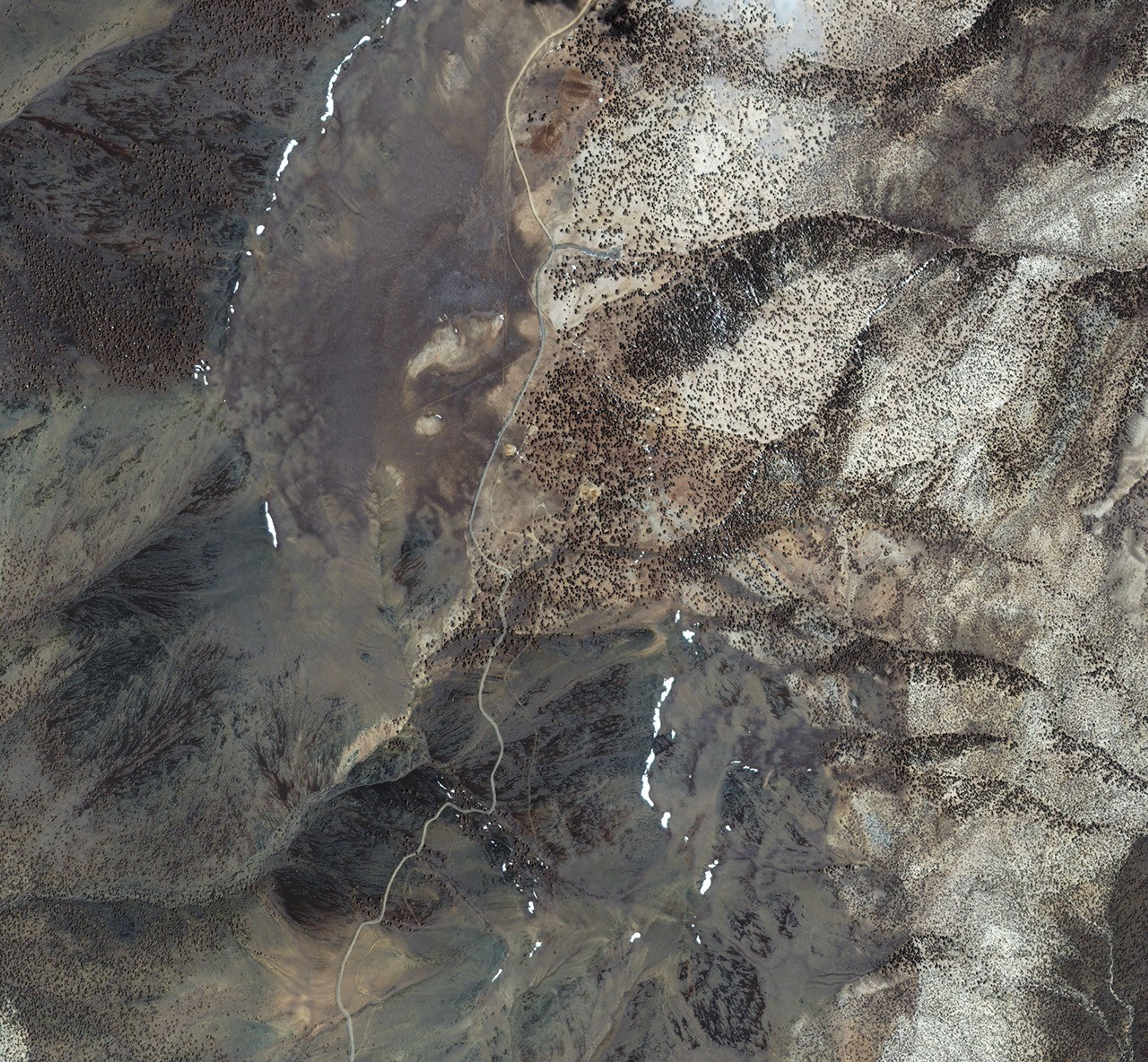 This image shows part of Schulman Grove, the location of the oldest bristlecones yet found (with the exception of one older tree found in Nevada in the early 1960s). It was acquired by Space Imaging’s Ikonos satellite on May 25, 2003. The access road and visitor center for the grove are visible in the upper-left hand corner. The Methuselah Walk, named for the grove’s oldest inhabitant, begins at the visitor center and winds up and down through the oldest trees at an elevation of about 2,800 meters (9,200 feet). Individual trees, several of them over 4,000 years old, are visible as dark spots in the image. Virtually all of the bristlecones live on beige dolomite soil, which bristlecones prefer to the surrounding brown granite soil. Trees on north-facing slopes grow faster and more densely than those on south-facing slopes due to the longer persistence of snow on the northern slopes. Patches of snow are still visible in this late-spring image.
