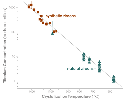 Watson’s own study of the Australian zircons supports the idea of a cooler, wetter Hadean. Several years ago, Watson and the students working in his lab began work on a titanium “thermometer”—an equation that describes how the titanium concentration in zircons changes as their crystallization temperature changes. Once they had the equation, geologists could estimate the temperature at which the Australian zircons crystallized more than 4 billion years ago by measuring the amount of titanium they contain.