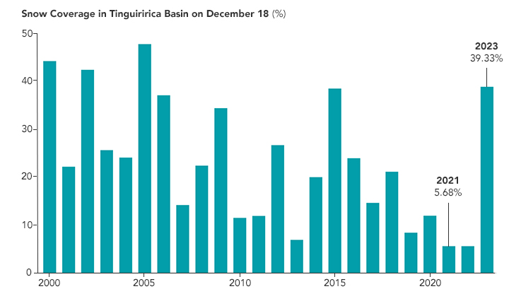 Data from the Observatorio de Nieve en los Andes de Argentina y Chile (above) show that mid-December snow coverage in the Tinguiririca Basin in 2023 stood well above levels seen in the past several years. The observatory supports a digital platform using data from NASA’s MODIS (Moderate Resolution Imaging Spectroradiometer) sensors to track snow cover in Andean drainage basins over time.