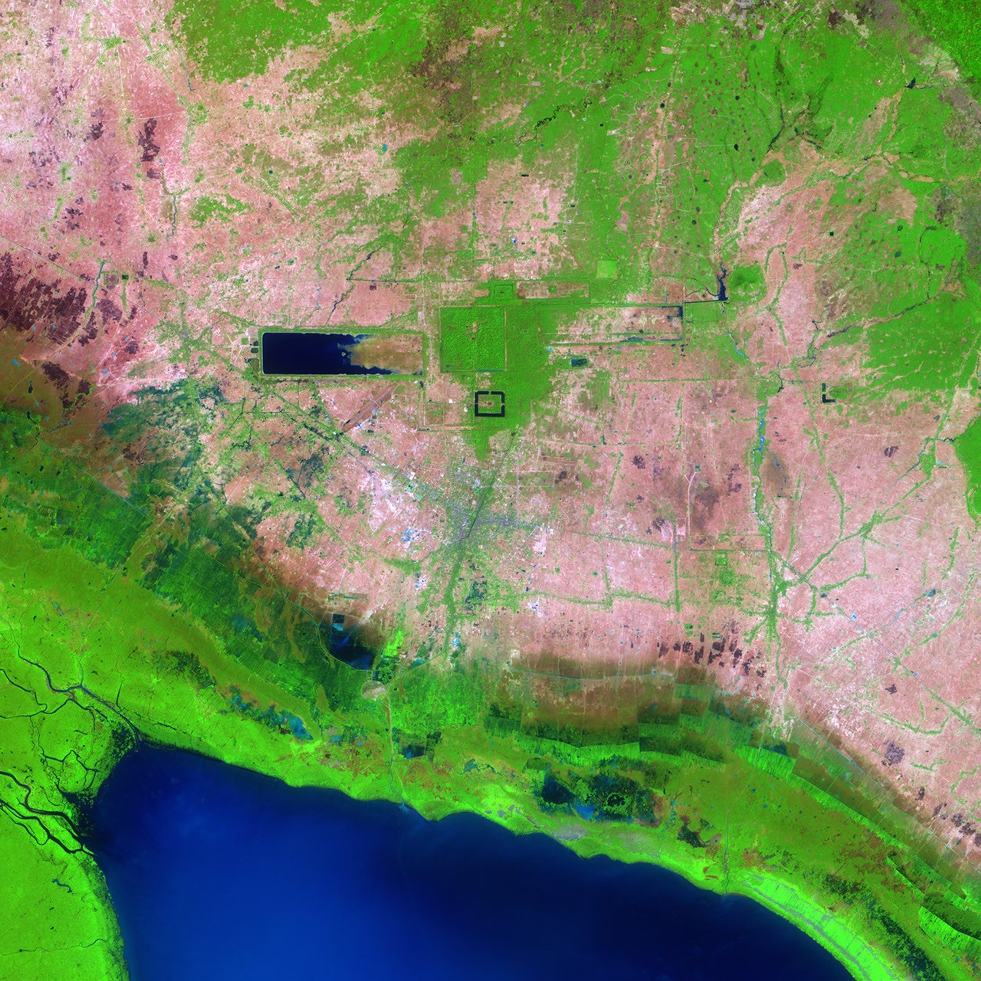 West of Angkor Thom is the vast Western Baray, a reservoir built in the 11th century. The earthen walls constructed to hold water form a perfect rectangle, oriented exactly east-west. It is thought that the Western Baray and its predecessor, the Eastern Baray, were built to provide water to the city, control water levels on the Siem Reap River, and provide irrigation water to the surrounding plain. Though filled with silt today, the smaller Eastern Baray is also visible in this image. Its earthen walls form a 1.8 by 7.5 kilometer rectangle east of Angkor Thom. Constructed in the 9th Century, the Eastern Baray was probably about 3 meters deep and held an estimated 37.2 million cubic meters of water.