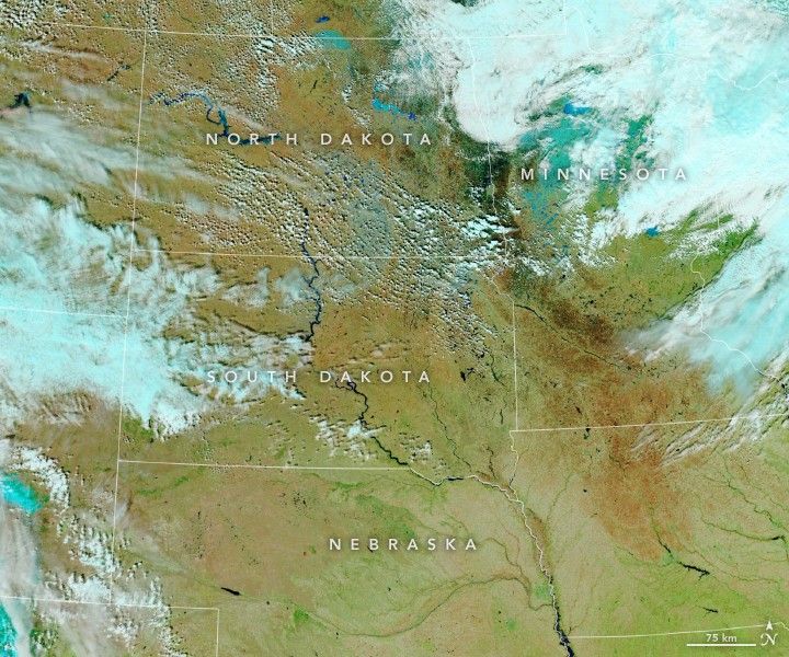 Many rivers in the region were already swollen with water (dark blue) before the storm arrived. Forecasters are wary that the influx of new snow could trigger new floods in the coming weeks; at a minimum, rivers will be high in the coming days. A few rivers in South Dakota—most notably the James and Big Sioux—were well above flood stage on April 15.