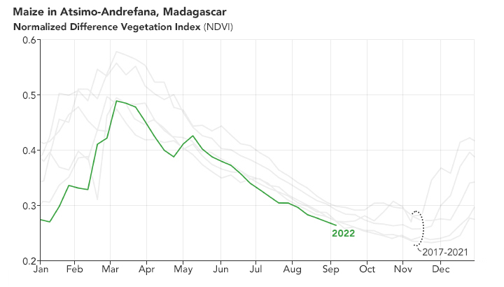 The NASA Harvest program, with international partners from the GEO Global Agricultural Monitoring (GEOGLAM) initiative, has developed several tools, including the Agmet Earth Observation Indicators, to monitor environmental factors relevant to food security. The chart above shows data from that tool. Based on NDVI observations, the health of the 2022 maize crop in Atsimo-Andrefana was the worst the area has seen in the past five years. Crop health during the previous two years was nearly as bad. Maize is normally harvested in mid-April.
