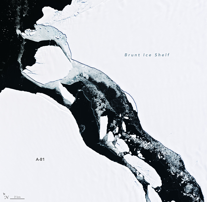 At the time of these images, Iceberg A-81 and other pieces of ice were drifting southward with the clockwise motion of the Weddell Gyre, although it remains to be seen where they will go from here. A previous berg that broke from the ice shelf in February 2021 (Iceberg A-74) followed the gyre. Its pieces now drift more than 500 kilometers away from Brunt near the Ronne-Filchner Ice Shelf.