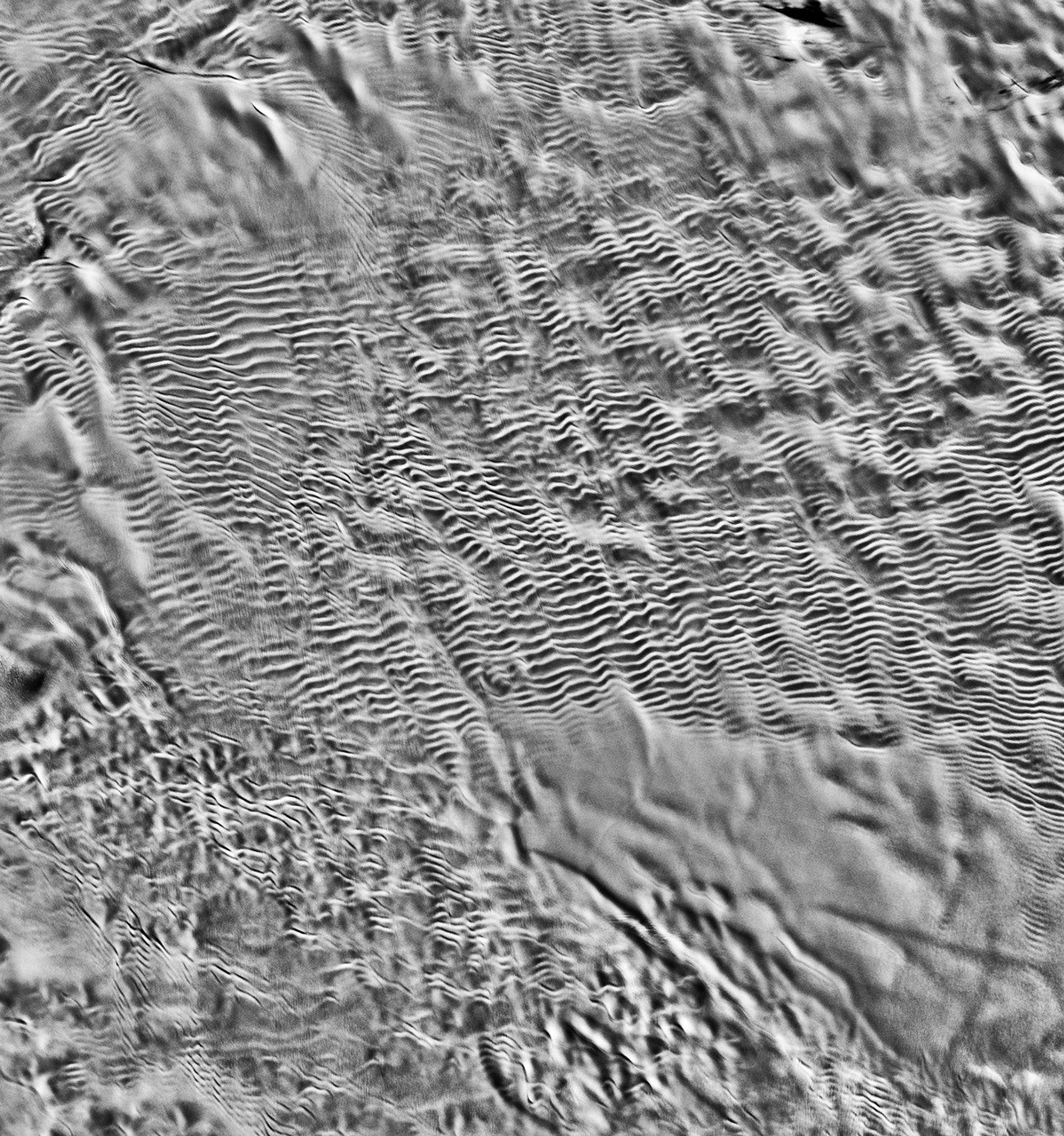 Megadunes ripple horizontally across these satellite images. Perpendicular to the megadunes is a corduroy-like pattern, most visible in the bottom satellite image. This pattern is created by linear sets of sastrugi, ubiquitous snow sculptures like frozen waves on the ocean. Among the megadunes, sastrugi assume huge, meter-high forms that, up close, can resemble leaping dolphins; the crests of the megadunes can also sport beast-like sastrugi.