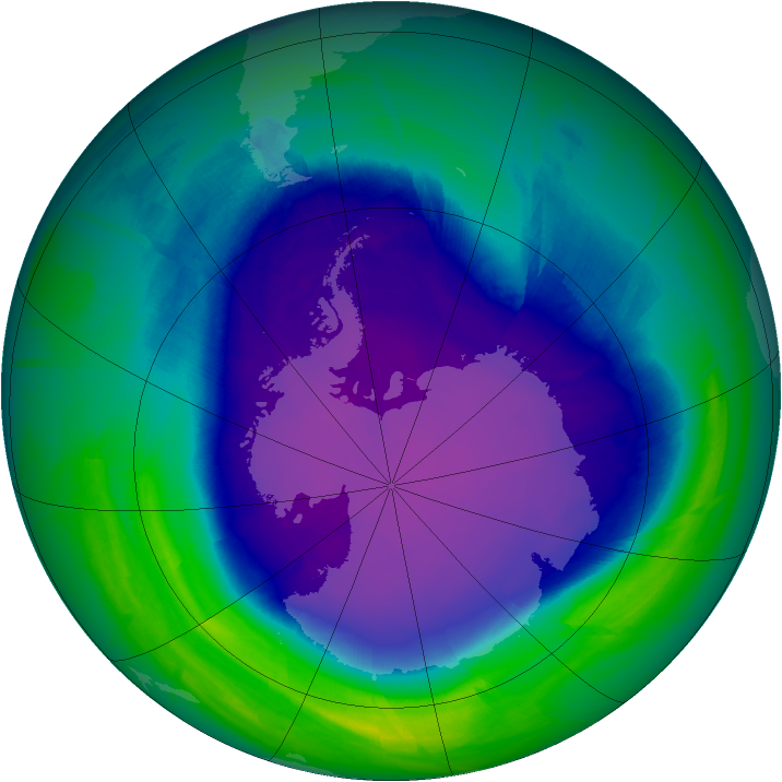 As the images show, the word hole isn’t literal; no place is empty of ozone. Scientists use the word hole as a metaphor for the area in which ozone concentrations drop below the historical threshold of 220 Dobson Units. Using this metaphor, they can describe the hole’s size and depth. These maps show the state of the ozone hole each year on the day of maximum depth—the day the lowest ozone concentrations were measured.