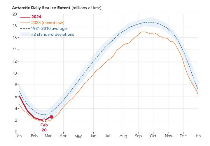 - NASA Earth Observatory (2023, March 16) Antarctic Sea Ice Reaches Another Record Low. Accessed March 12, 2024.