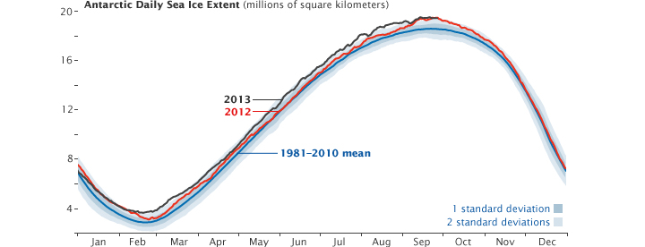 - National Snow and Ice Data Center (2013, September 17) Antarctic Sea Ice Extent (bottom of page). Accessed September 27, 2013.