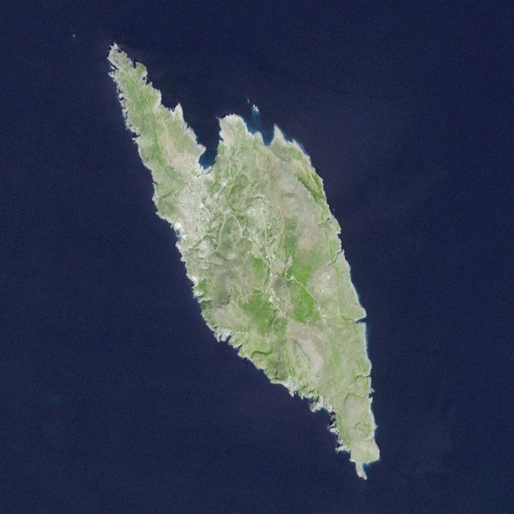 This view of Antikythera was acquired on September 23, 2013, by the Advanced Spaceborne Thermal Emission and Reflection Radiometer (ASTER) on the Terra satellite. The landscape is typical of a small Mediterranean island, consisting primarily of open countryside and low shrubs. Steep, limestone cliffs line most of the island; flatter expanses of beach are more common on Kythira, a larger Greek island to the north.