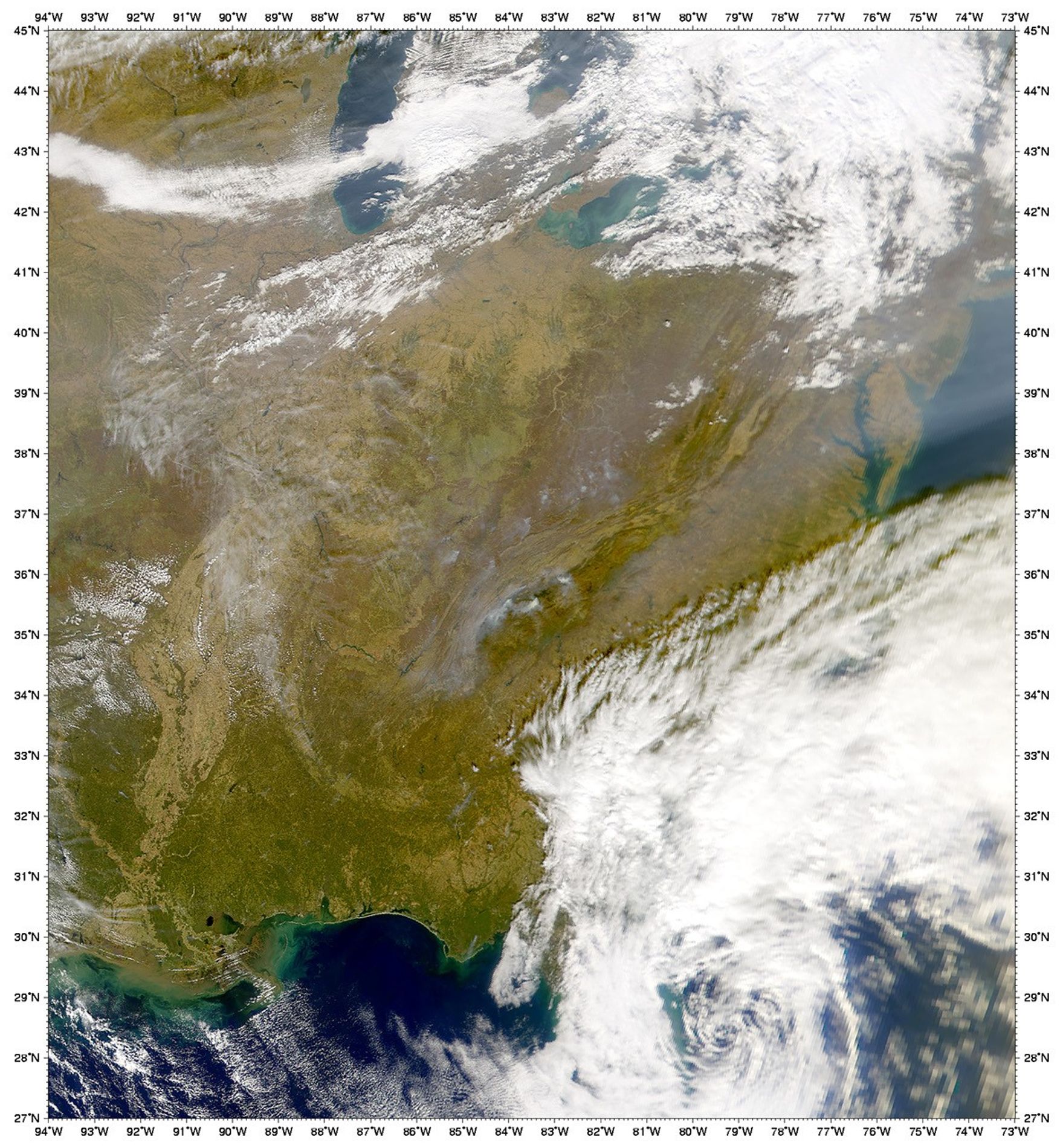 This image of smoke from forest fires in Virginia, Kentucky, and WestVirginia was taken by the Sea-viewing Wide Field-of-view Sensor(SeaWiFS) on November 15, 2001. Smoke is visible extending over the Chesapeake Bay.