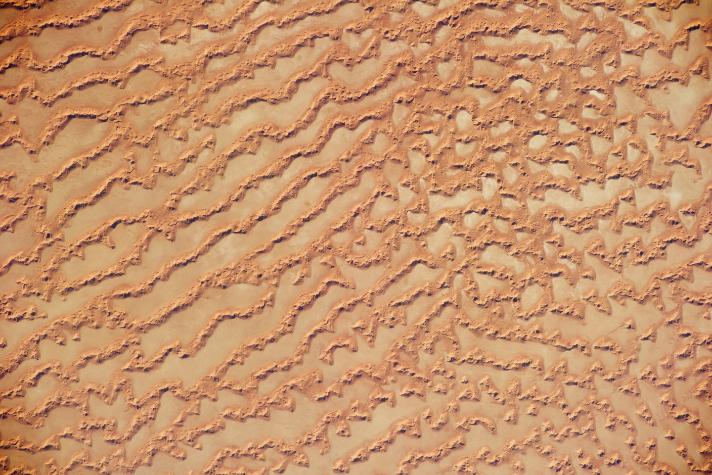 The Ar Rub’ al Khali, also called the “Empty Quarter,” is a large region of sand dunes and interdune flats known as a sand sea or erg. This astronaut photograph highlights a part of the Ar Rub’ al Khali near its southeastern margin, in the Sultanate of Oman.