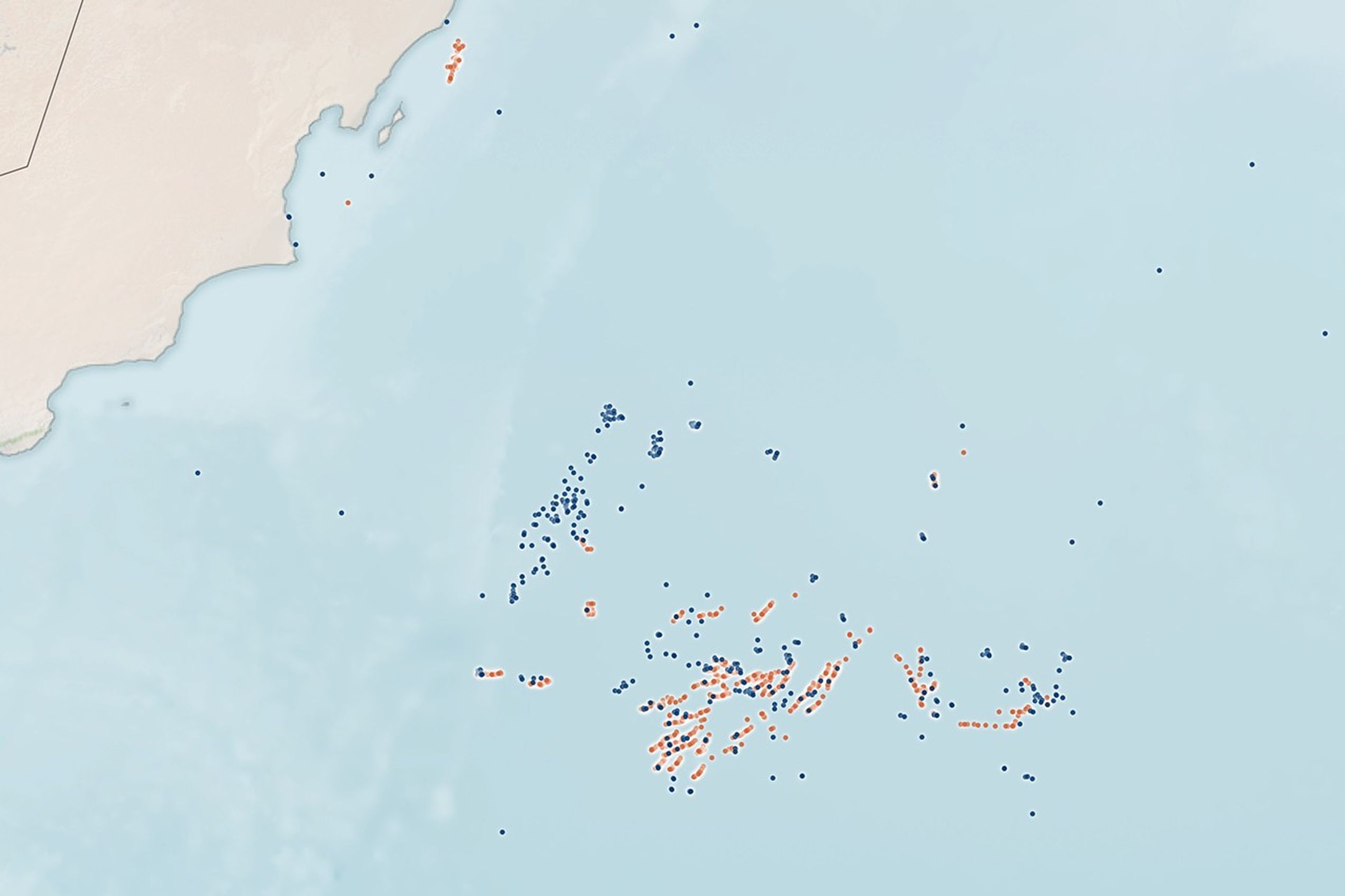 AIS signals alone cannot capture the full scale of industrial fishing. Signal interference and faulty equipment can distort ship numbers; other times, fishing boats turn off the beacons in order to avoid pirates or fishing enforcement agencies. This is where night light detection can reveal what official systems might not detect. The map above, derived from Global Fishing Watch data, shows ships detected by AIS beacons in orange and those detected by VIIRS day-night band in blue.