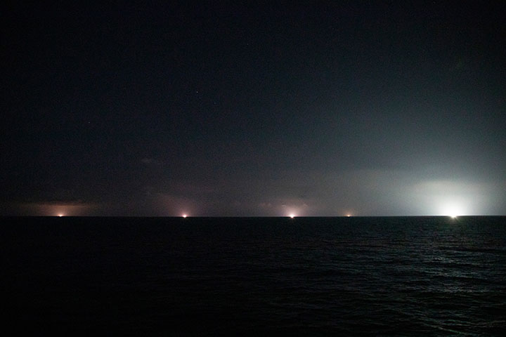 In the image above, points of light in the Arabian Sea (northwest Indian Ocean) indicate the locations of fishing boats, refrigerated cargo ships, and perhaps a few other large ships. The fishing boats stand out because they use high-intensity lights to draw squid, saury, and other fish toward the water surface, where they are more easily caught with jigging lines and purse seine nets. Squid boats can carry more than a hundred lamps and generate as much as light as a house. The photo below (courtesy of Trygg Mat Tracking) shows fishing boats lighting up the horizon of the Arabian Sea in April 2021.
