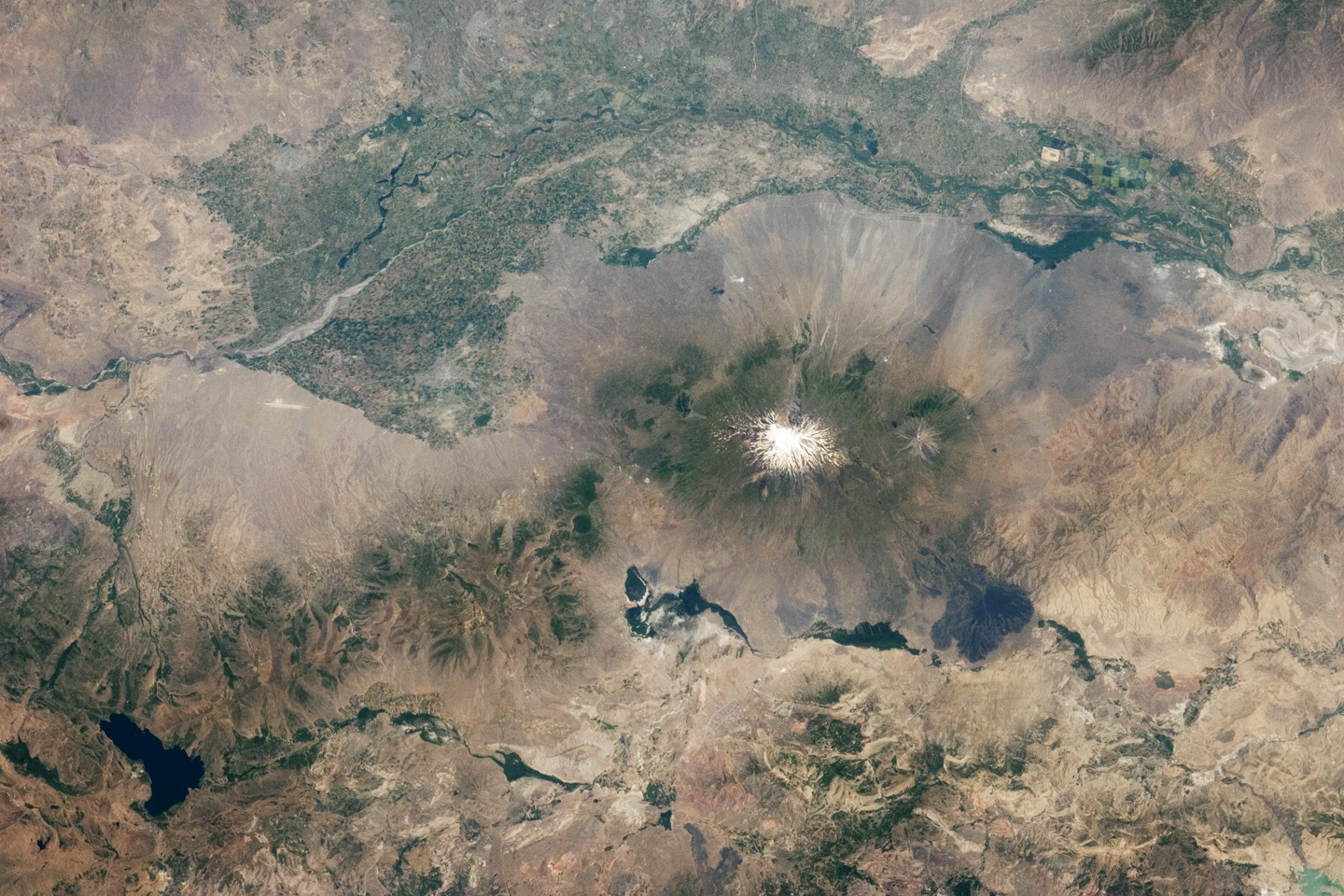 The white, glacier-clad peak of Mt. Ararat is evident at image center; dark green areas on the lower slopes indicate where vegetation cover is abundant. A large lake, Balik Golu or Fish Lake, is visible to the west (image lower left).