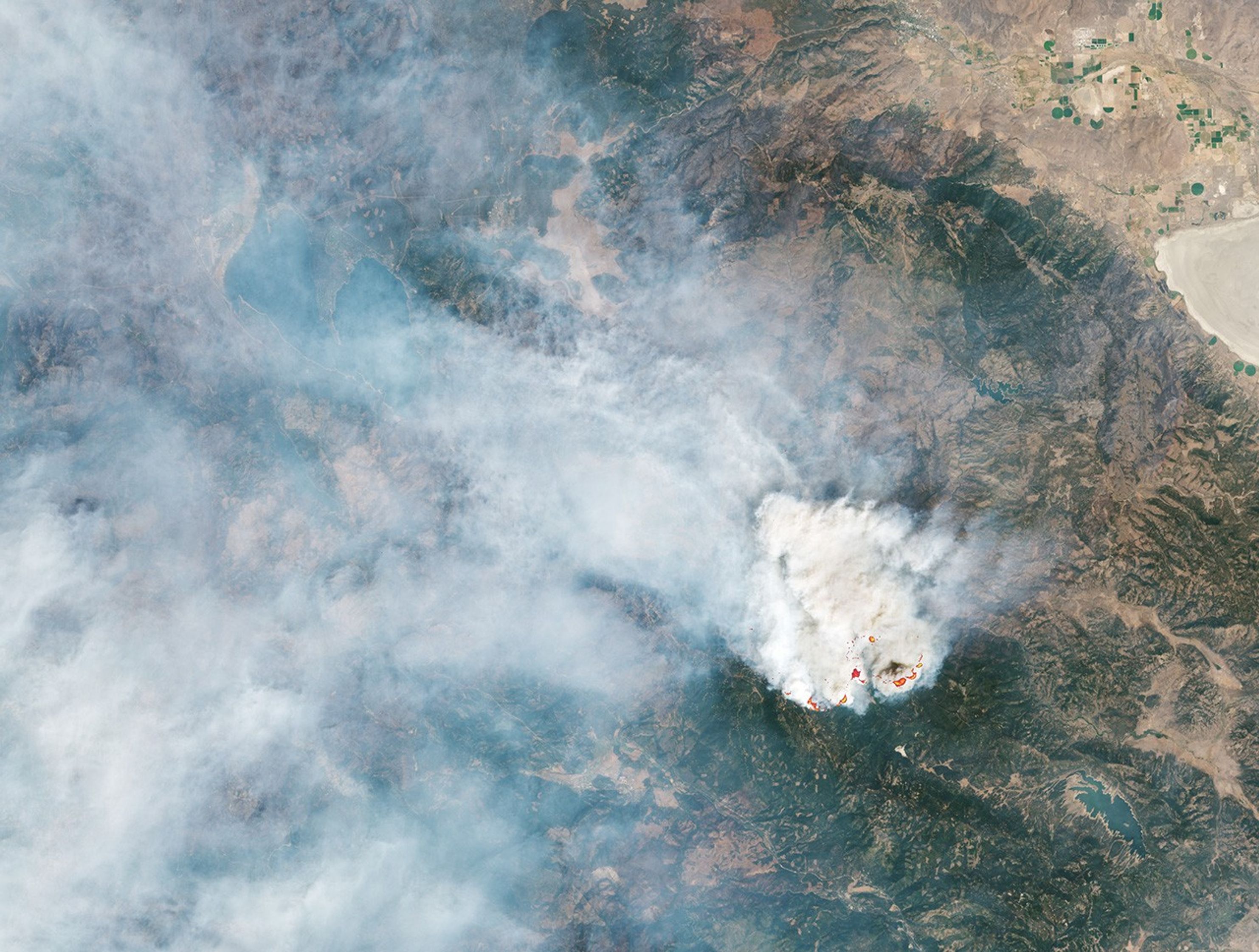 Smoke from the Dixie fire is visible in the second image above, acquired on August 28, 2021, with the Operational Land Imager (OLI) on Landsat 8. The infrared signatures of actively burning areas are outlined in red. Evacuation orders have been lifted on the fire’s western side, but they were replaced on August 30 with new evacuation orders as the fire approached Lake Davis.