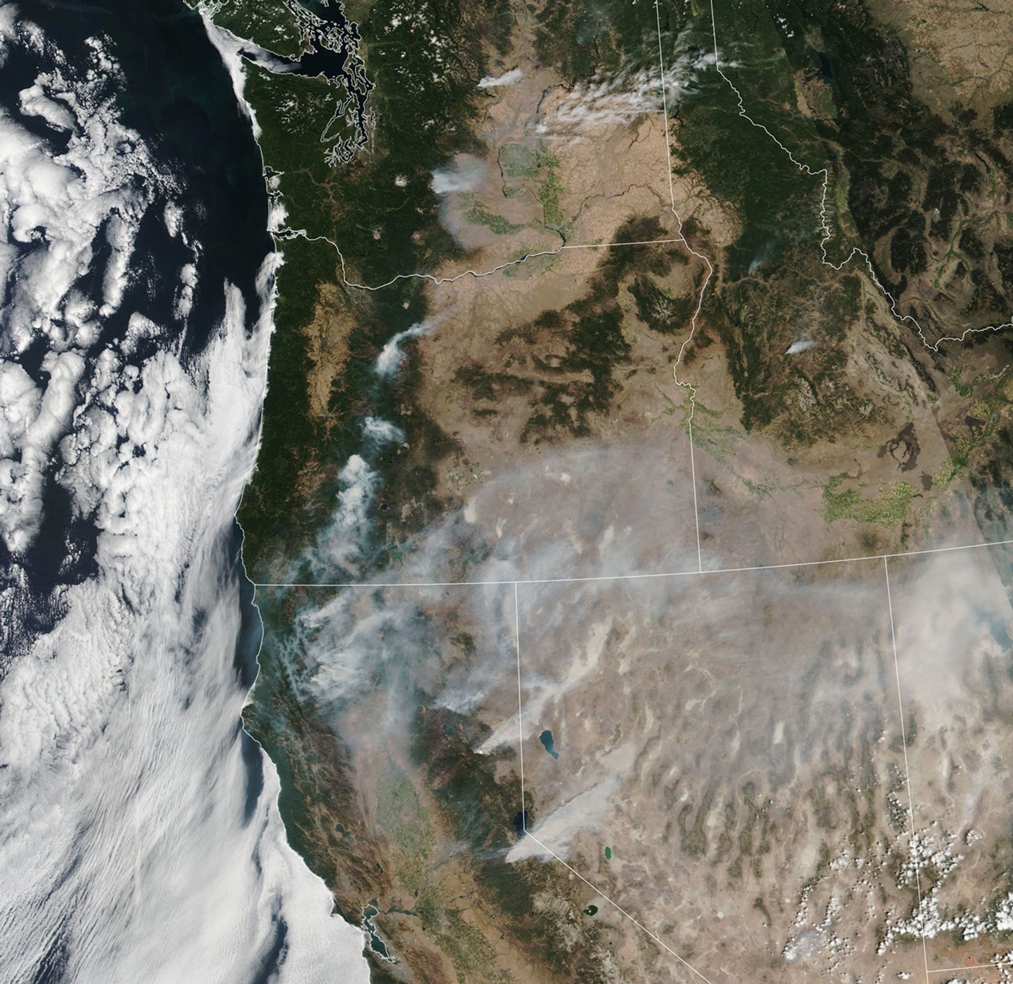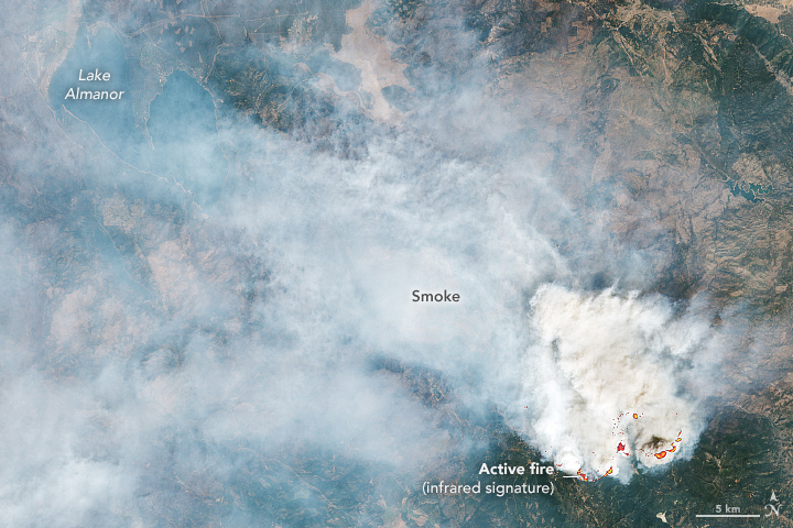 The largest blazes burned in Northern California, most notably the Caldor and Dixie fires, which together have scorched nearly 1 million acres (1,500 square miles) so far. Smoke from the Caldor fire near Lake Tahoe is visible in the image above, acquired on the afternoon of August 30, 2021, with the Moderate Resolution Imaging Spectroradiometer (MODIS) on NASA’s Aqua satellite. Between ignition on August 14 and the time of the image, the fire had burned more than 170,000 acres. The fire perimeter was 14 percent contained as of August 31.