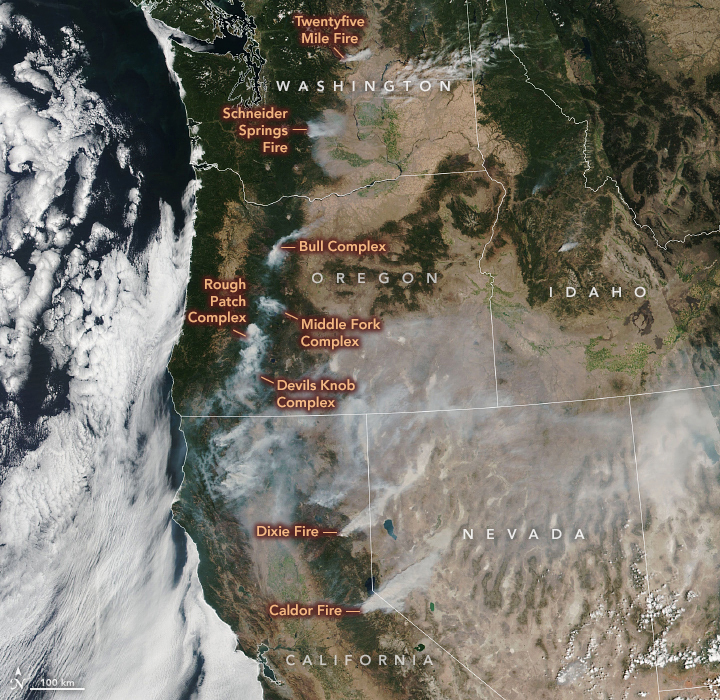 While the Caldor and Dixie fires are the largest, other wildfires are also posing hazards to people, property, and air quality across the U.S. West. On August 29, 2021, the Visible Infrared Imaging Radiometer Suite (VIIRS) on the NOAA-NASA Suomi NPP satellite acquired this image showing the ominous arc of fires across Washington, Oregon, and California.