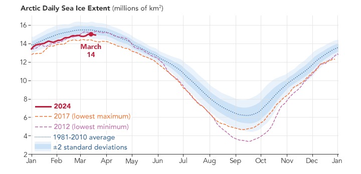 - National Snow and Ice Data Center (2024, March 25) Arctic sea ice reaches a below-average maximum. Accessed March 25, 2024.