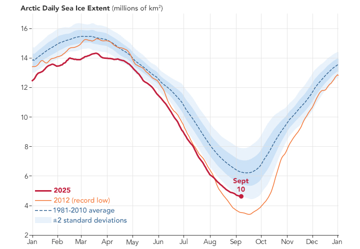 - National Snow and Ice Data Center (2025, September 17) 2025 Arctic sea ice minimum squeezes into the ten lowest minimums. Accessed September 18, 2025.