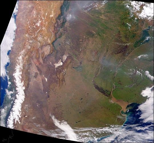 Boasting the highest mountain as well as the greatest expanse of low-lying wetlands in the Western Hemisphere, lower South America is a sight to behold at any altitude. This true color image of lower South America was acquired on March 27, 2000, by the Moderate-resolution Imaging Spectroradiometer (MODIS), flying aboard NASA’s Terra spacecraft. The Andes run all along the left-hand side of the image, starting out wide up top and narrowing as they move south. The white spine-like strip along the lower Andes is snow. Mount Aconcagua, the tallest mountain in the Western Hemisphere, is located in this section of the Andes.