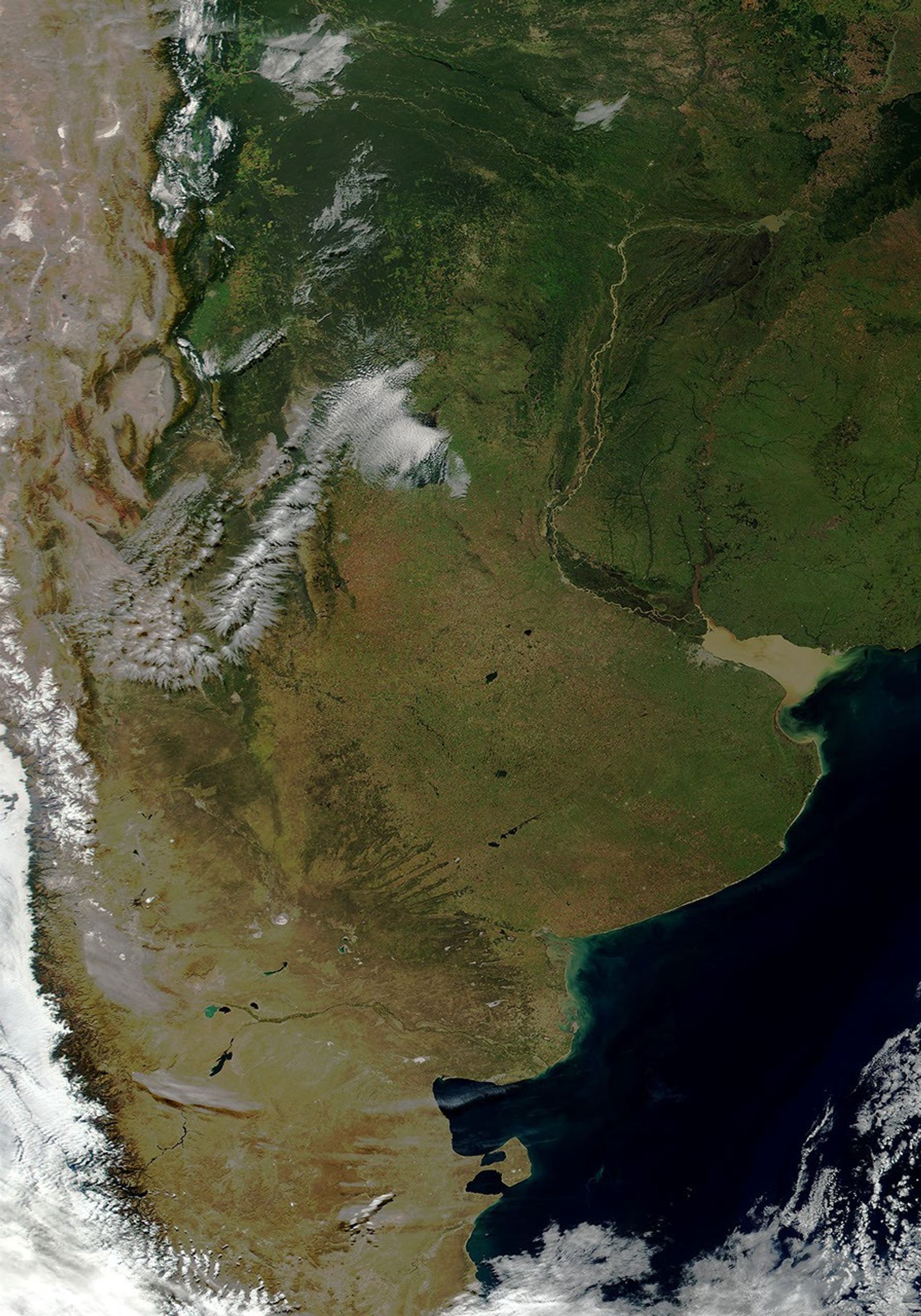 This Moderate-resolution Imaging Spectroradiometer (MODIS) image over Argentina was acquired on April 24, 2000, andwas produced using a combination of the sensor's 250-m and 500-mresolution "true color" bands. This image was presented on June 13, 2000 as a giftto Argentinian President Fernando de la Rua by NASA Administrator DanGoldin.