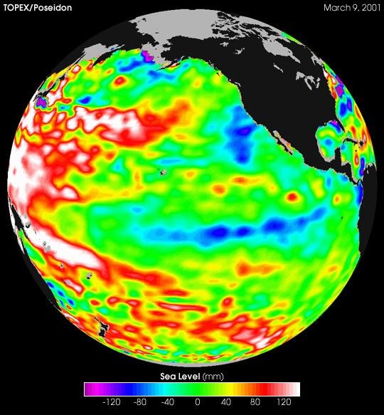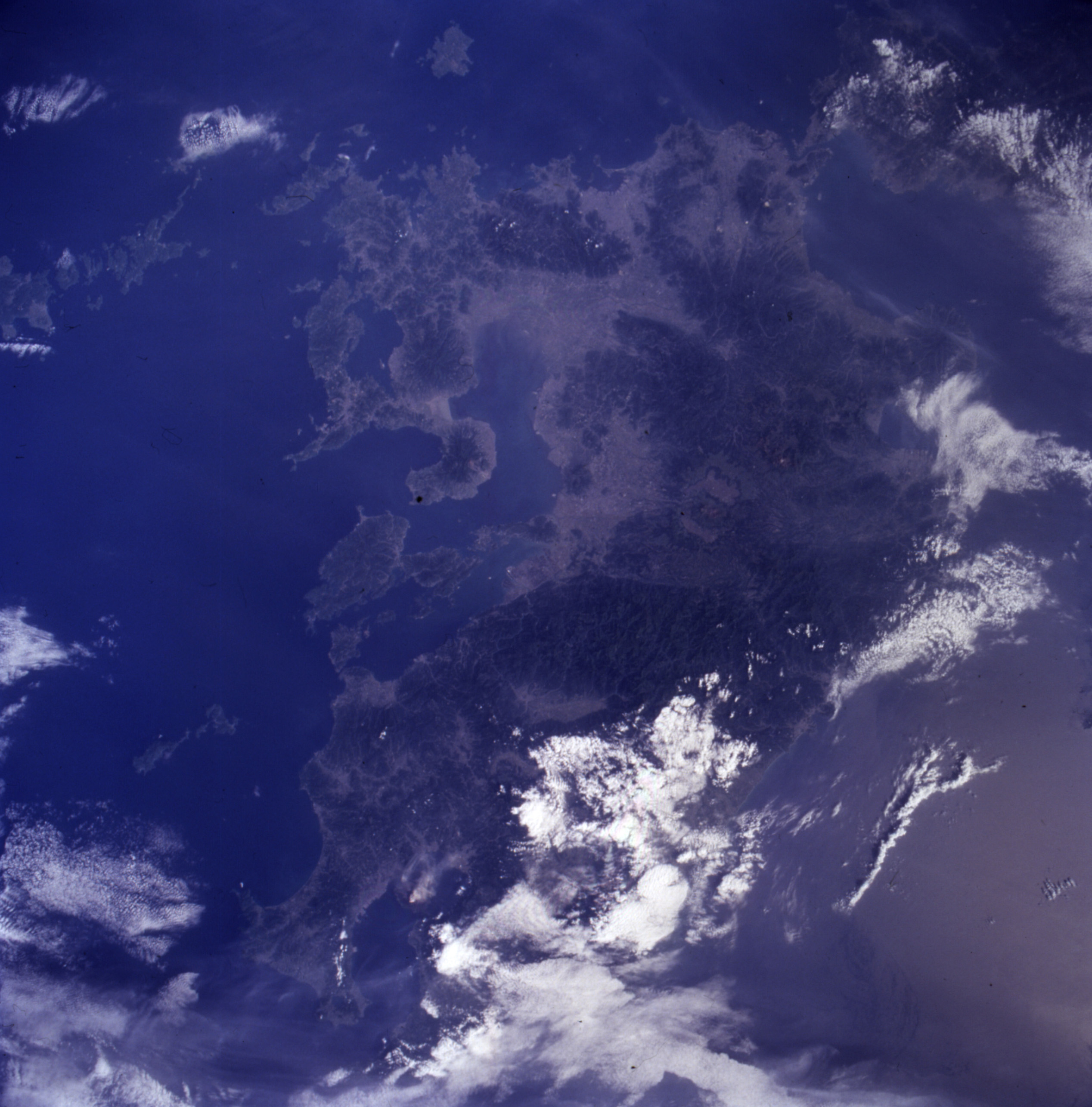 The Isahaya Bay Reclamation project separated approximately 3,000 hectares of tidal flats from the Ariake Sea in 1997. This photograph was taken from the Space Shuttle on April 27, 1998, a year after the sea wall separating Isahaya Bay from the rest of the Ariake Sea was closed. The reflective white area (center arrow) shows the straight edge of the sea wall and the drying tidal flats.