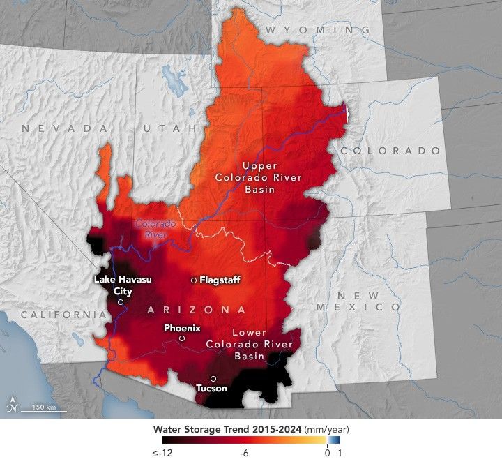 NASA Earth Observatory images by Wanmei Liang , using data from Abdelmohsen, K., et al. (2025) , boundary data from Colorado River Basin GIS Open Data Portal , and Landsat data from the U.S. Geological Survey . Oceanic Niño Index chart based on data from the Climate Prediction Center at NOAA. Story by Adam Voiland .
