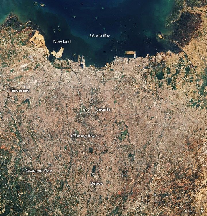 Since the first image above was captured in 1990, artificial land and new development has spread into the shallow waters of Jakarta Bay. According to one analysis of Landsat data, people have built at least 1185 hectares (5 square miles) of new land along the coast. Much of the land has been used for high-end residential developments and a golf course, explained Dhritiraj Sengupta, a remote sensing scientist at East China Normal University. Such developments come with risks because they sit at the front lines of Jakarta’s inevitable battle against sea level rise and storm surges, cautioned Sengupta.