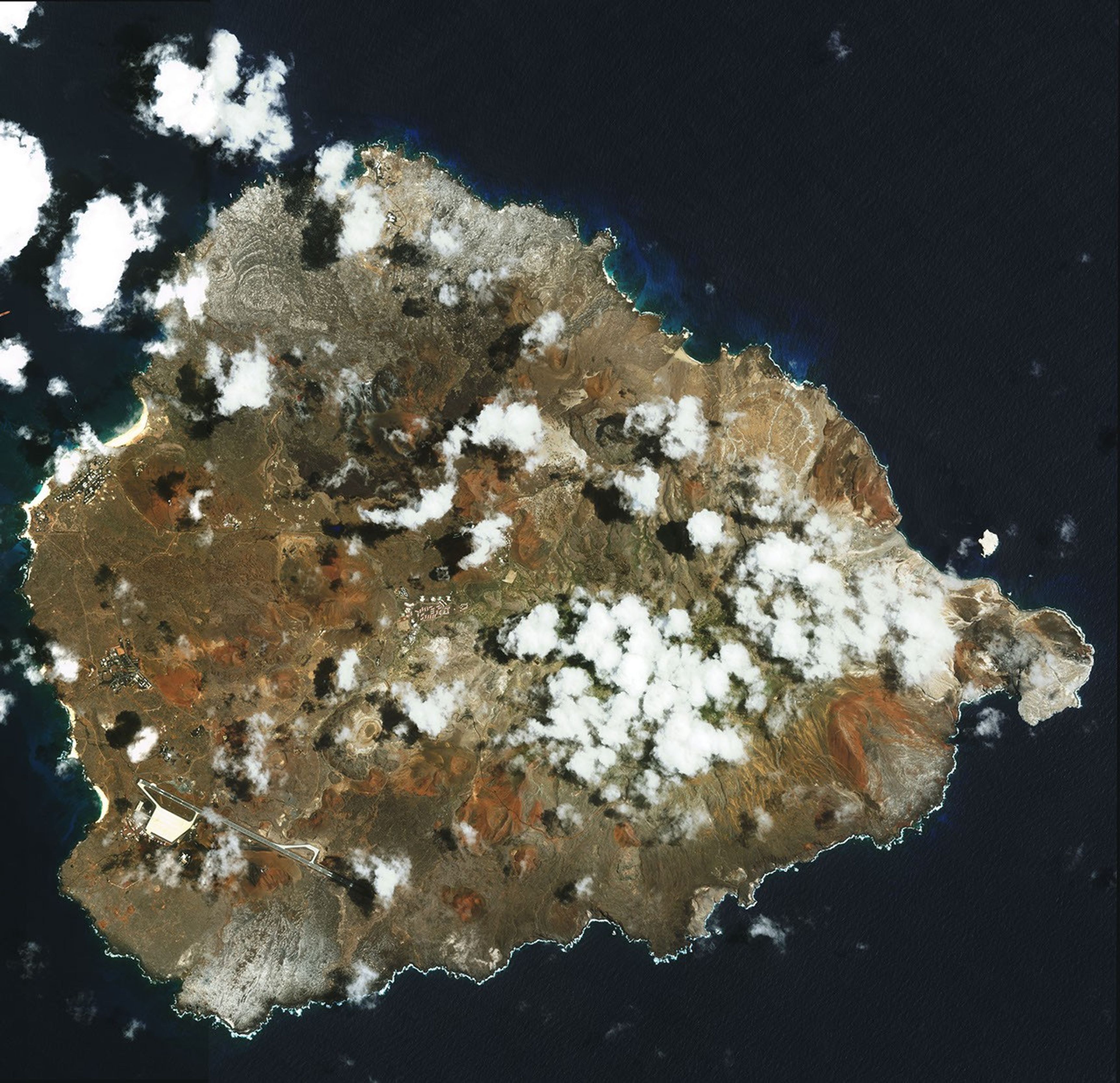 In the southern Atlantic Ocean roughly midway between central South America and central Africa, sits Ascension Island. A small, rocky, volcanic outcrop covered in many places by lava flows and cinder cones of dormant volcanoes, the island sits just west of the Mid-Atlantic Ridge. In this amazingly detailed image from the Ikonos satellite on February 24, 2003, marbled-looking lava flows can be seen dominating the northwest coast, with smaller flows visible on the southwest coast below the island’s Wideawake Airfield, as well as on the southeast coast. Northeast of the airstrip, a large cinder cone is visible, its dark brown center fading to tan is a series of pale rings. This crater, the island’s largest, is called Devil’s Riding School. Crisp, white surf breaks along the shores.