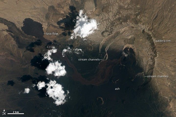 In the natural-color image, the arid landscape is light brown where it is not covered by ash. The ash is black, while a fresh lava flow, spewed out in the last two weeks of June, is dark brown. More fresh lava flows surround the active vents. On either side of Nabro’s caldera, ephemeral streams have washed away the ash, leaving light-colored channels behind—a first sign of the erosion that will reshape, and eventually remove, what the eruption built.