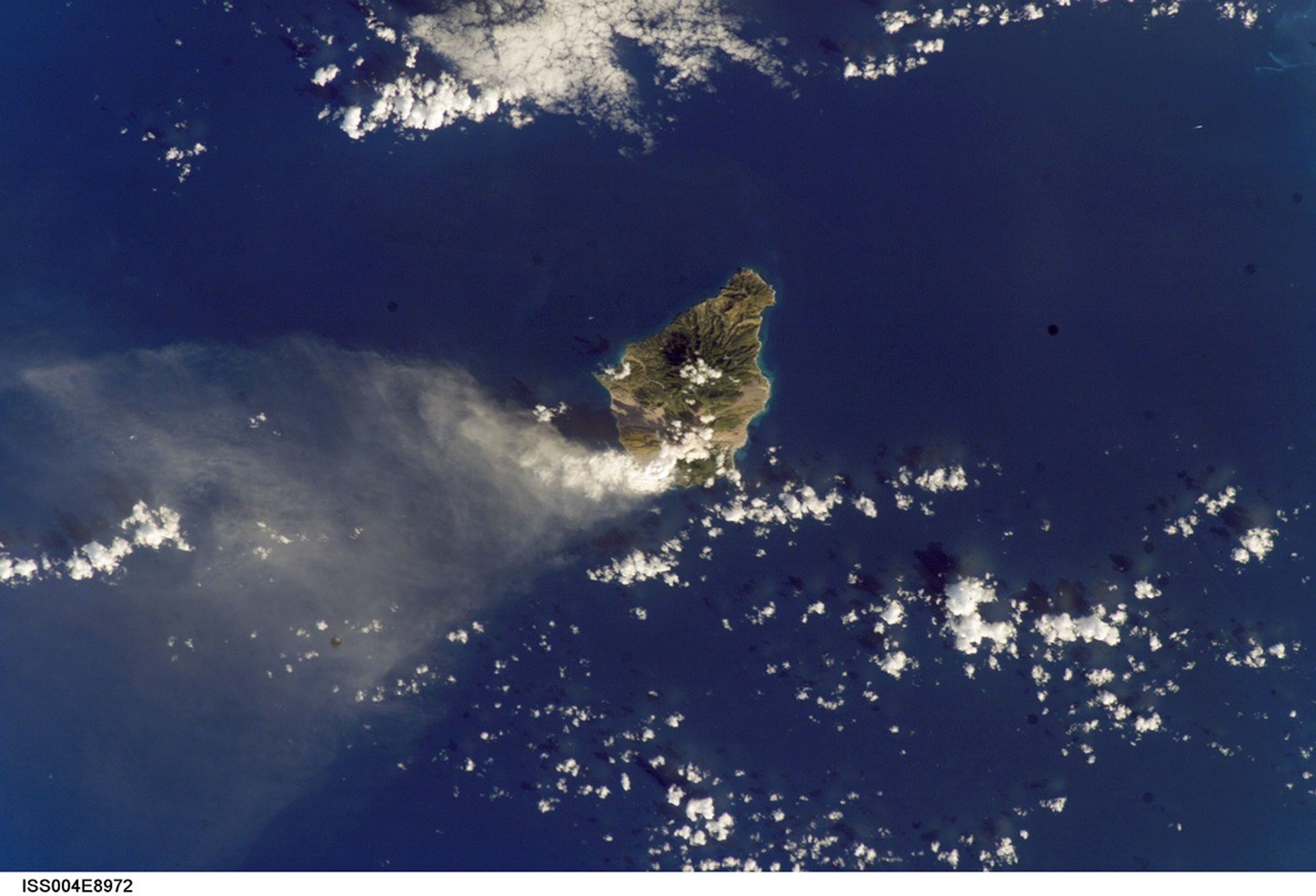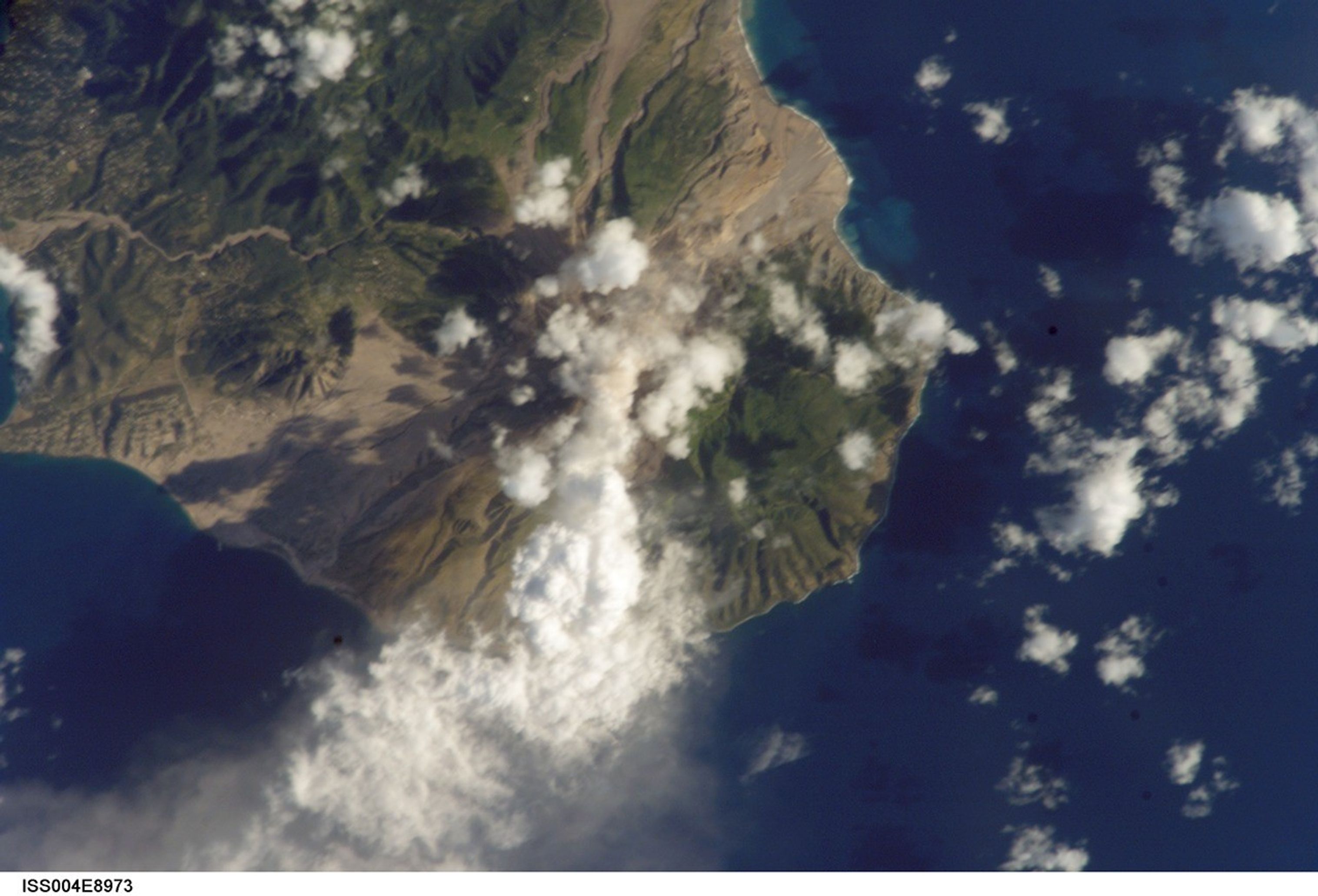 International Space Station crew members are regularly alerted to dynamicevents on the Earth’s surface. On request from scientists on the ground, theISS crew observed and recorded activity from the summit of Soufriere Hills onMarch 20, 2002. These two images provide a context view of the island (bottom)and a detailed view of the summit plume (top). When the images were taken, theeastern side of the summit region experienced continued lava growth, and reportsposted on the Smithsonian Institution’s Weekly Volcanic Activity Report indicatethat “large (50-70 m high), fast-growing, spines developed on the dome’s summit.These spines periodically collapsed, producing pyroclastic flows down thevolcano’s east flank that sometimes reached the Tar River fan. Small ash cloudsproduced from these events reached roughly 1 km above the volcano and drifted westwardover Plymouth and Richmond Hill. Ash predominately fell into the sea. Sulfur dioxideemission rates remained high. Theodolite measurements of the dome taken on March 20 yielded a dome height of 1,039 m.”