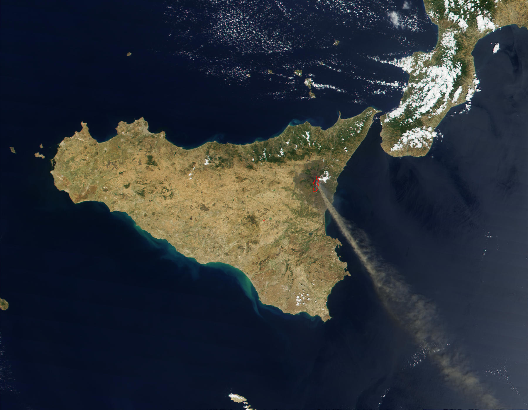 In northeastern Sicily, Mt. Etna continues to erupt. NASA’s Moderate-resolution Imaging Spectroradiometer (MODIS) on the Terra satellite captured this true-color image of the volcano on July 22, 2001. (MODIS captured a more recent image of Mt. Etna on July 24, 2001.) The eruption has opened five vents in the mountain, and is releasing a cloud of ash that can be seen stretching southeastward over the Mediterranean Sea. The red box overlaid on Mt. Etna shows where MODIS detected heat escaping from the volcano.